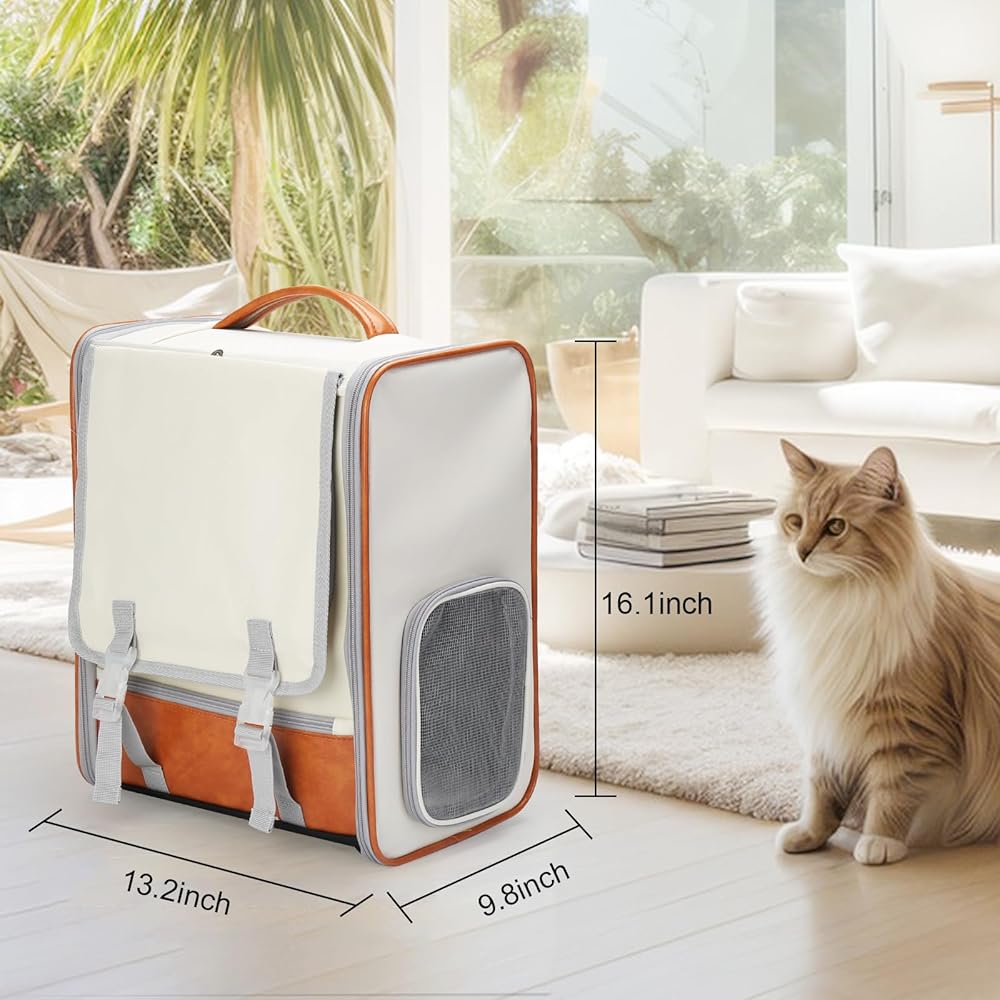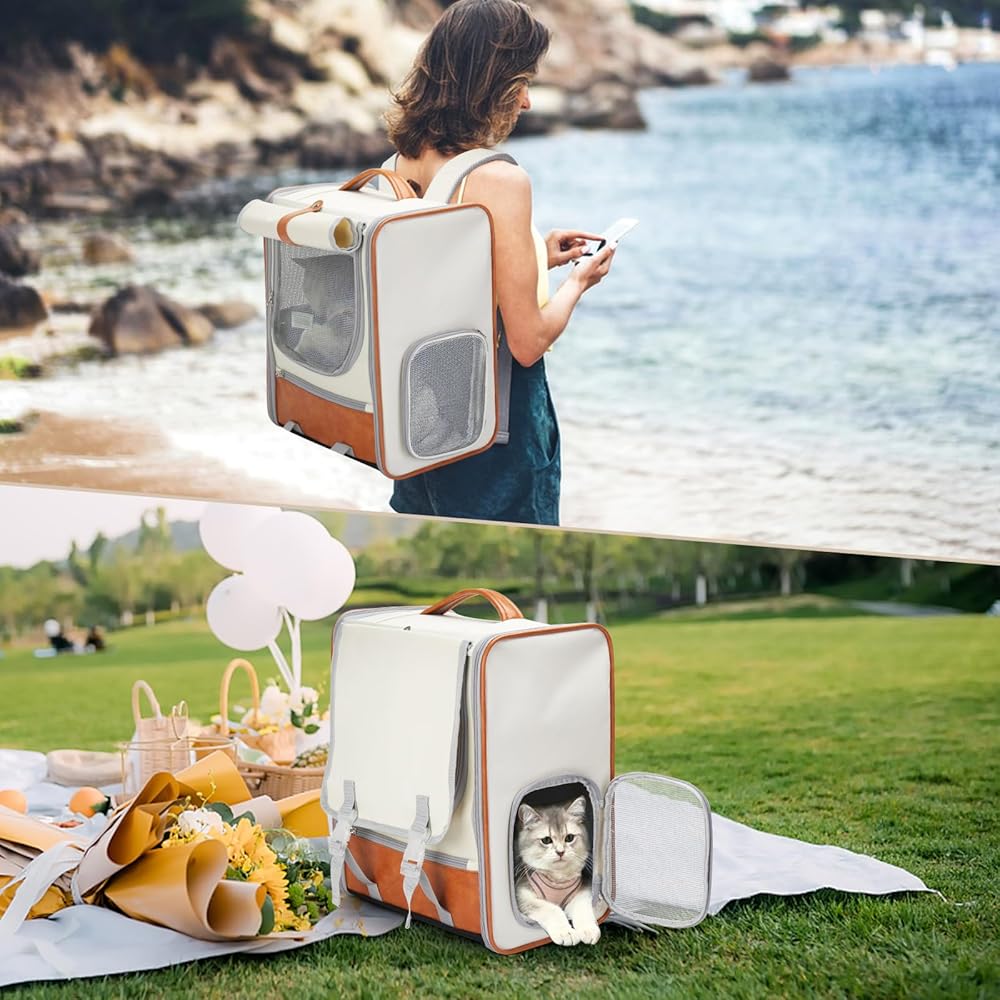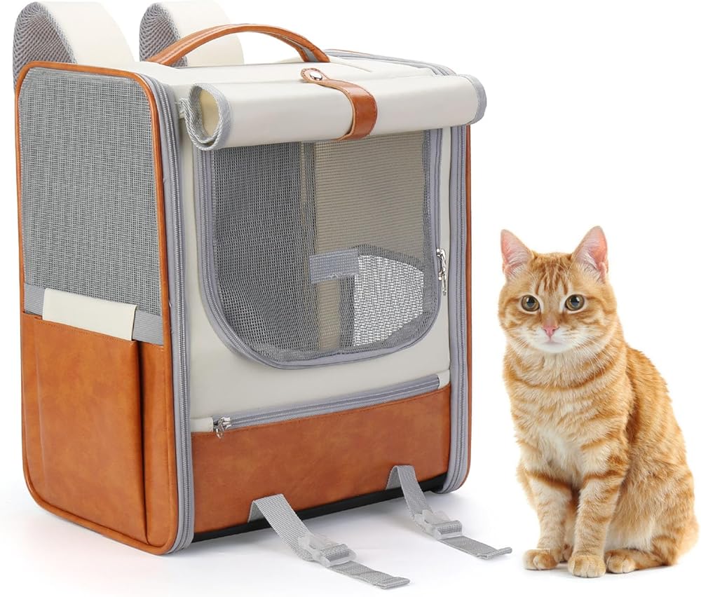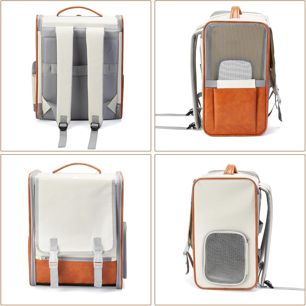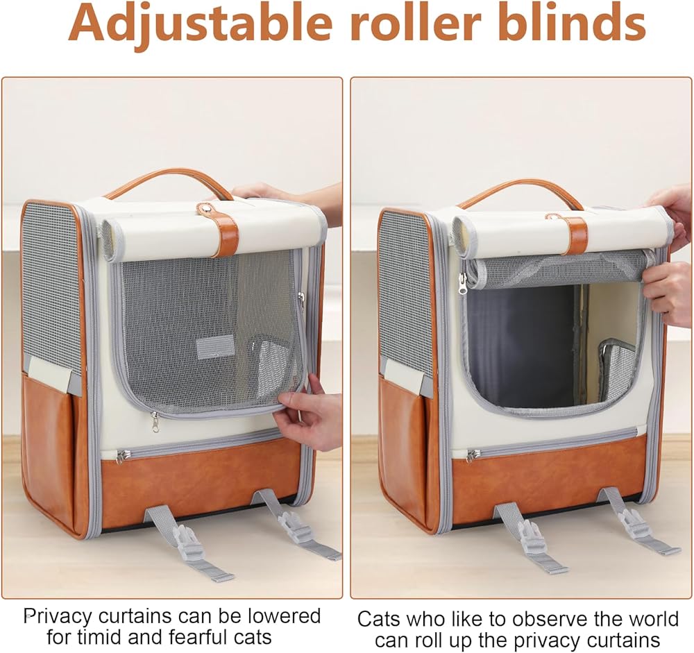 Adjustable roller blind design, three sides honeycomb breathable mesh (two side ventilation holes + front breathable mesh), side zipper small window, easy to cat duh in and out/watch the cat.Leather carrying strap design, can be carried over both shoulders or handheld.Suitable for: cats up to 17 pounds; dogs up to 15 pounds.Suitable for indoor or outdoor carry as well as car carry.Product material: oxford cloth, PU.