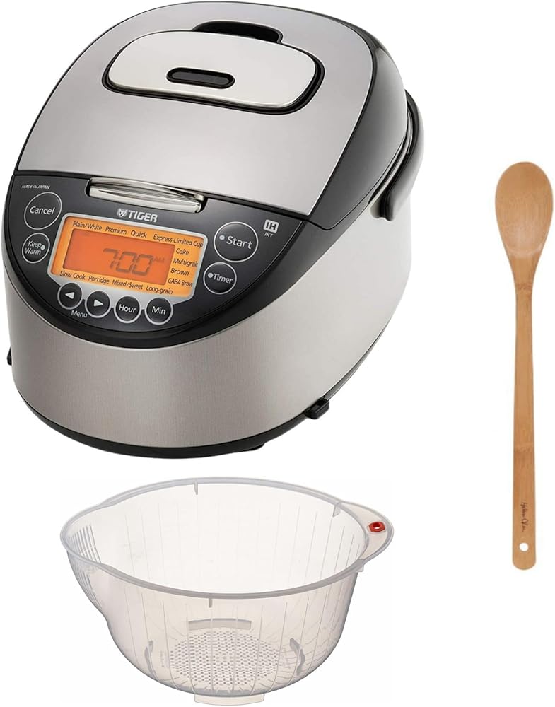 Bundle Includes: Tiger JKT-D18U 10-Cup Capacity Induction Heating Electric Rice Cooker (Black and Stainless Steel), Asian Kitchen Bamboo Spoon (15-Inch), and 9.5-inch Rice Washing Bowl with Side and Bottom Drainers (Clear)