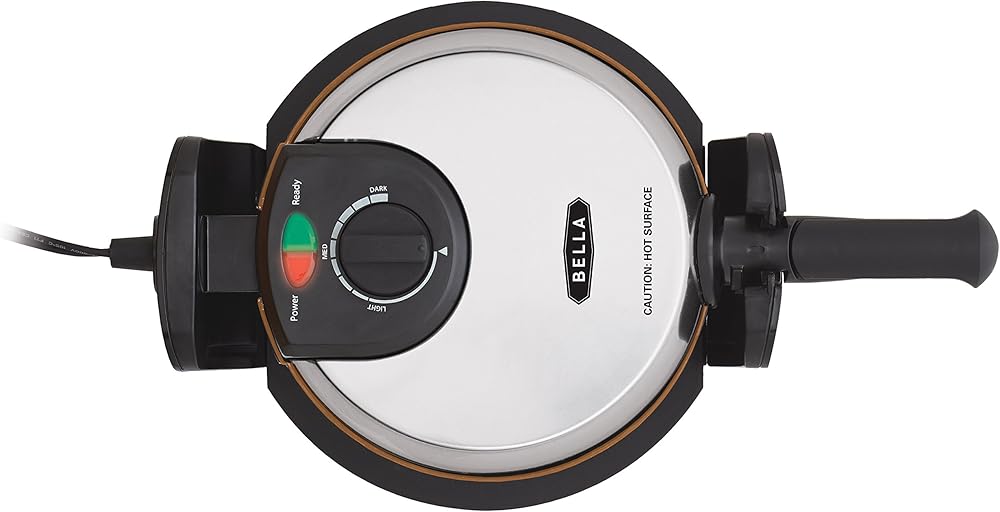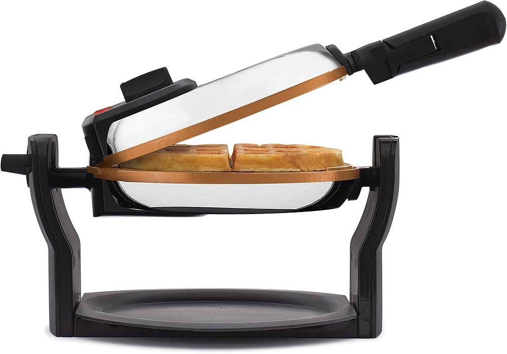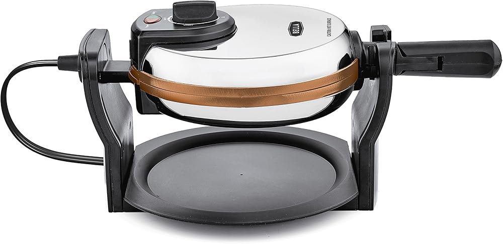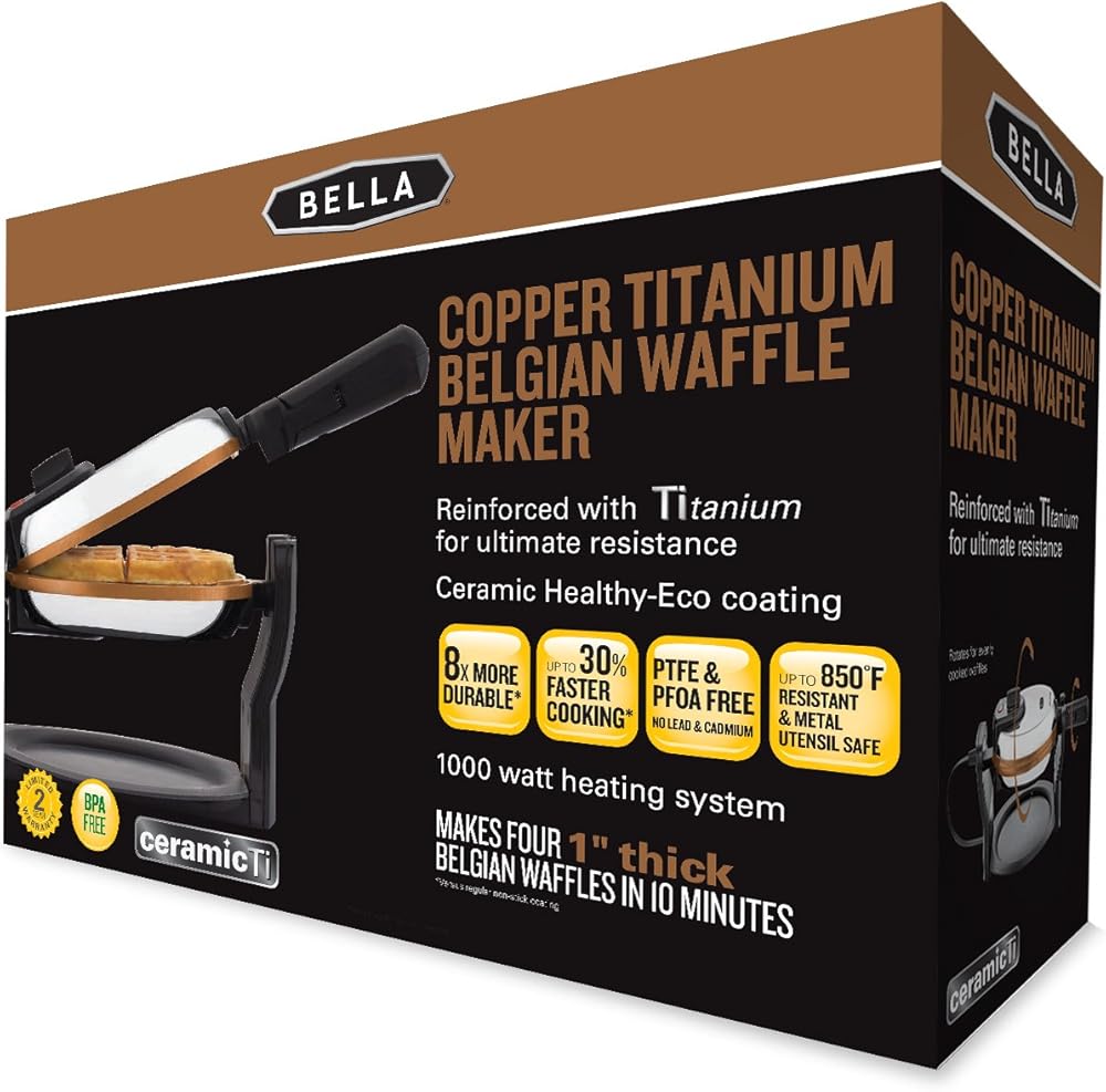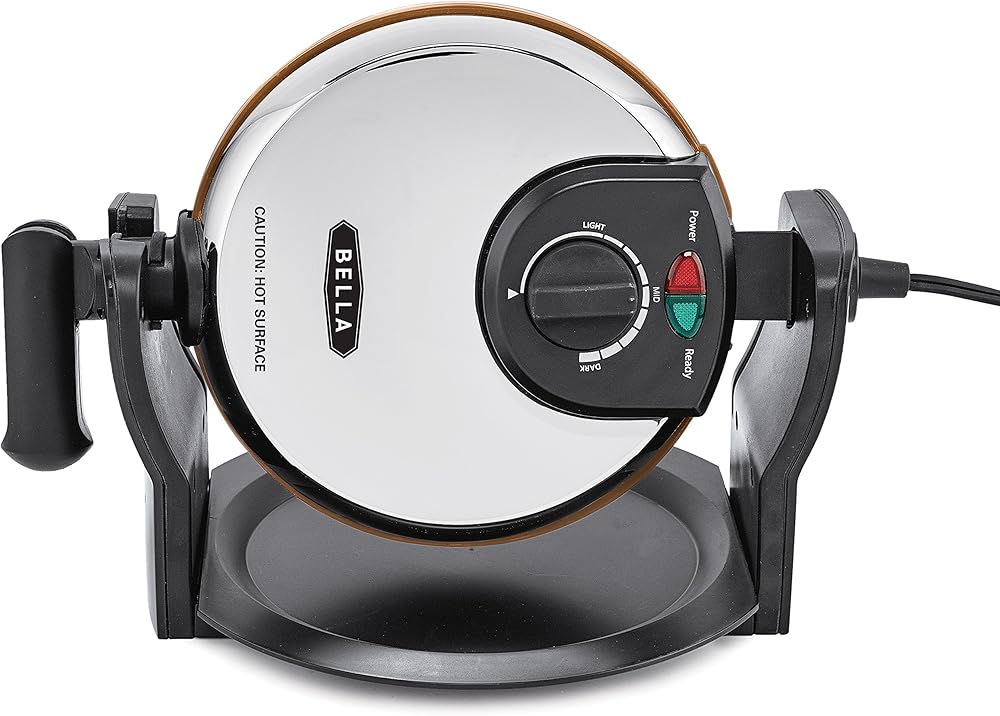 Who says waffles are just for breakfast? With the BELLA Copper Titanium Rotating Waffle Maker, you can enjoy fresh Belgian waffles morning, noon, or night, and the toppings options are nearly endless. Go with classic butter and syrup, or try some fresh strawberries of blueberries. For a savory variation, pair your waffles with some fried chicken. Or if you're in the mood for dessert, try chocolate chips and whipped cream. With a rotating function that allows for even cooking, the Rotating Waffle Maker produces waffles with uniform crispness. The browning control dial offers nine settings, so you can precisely cook your waffles to the level of darkness you prefer. A proprietary specialized Copper Titanium nonstick surface delivers optimal fast-action cooking while waffles come out fully intact ensuring superb waffles. After cooking, simply wipe the cooled cooking surface with a soft cloth to clean. The removable drip tray catches runoff batter and crumbs for easy cleaning. Auto-Lock and Nonslip feet prevent spills and dangerous accidents around the kitchen. The folding handle makes it convenient to store the Rotating Waffle Maker until the next time you crave homemade waffles.