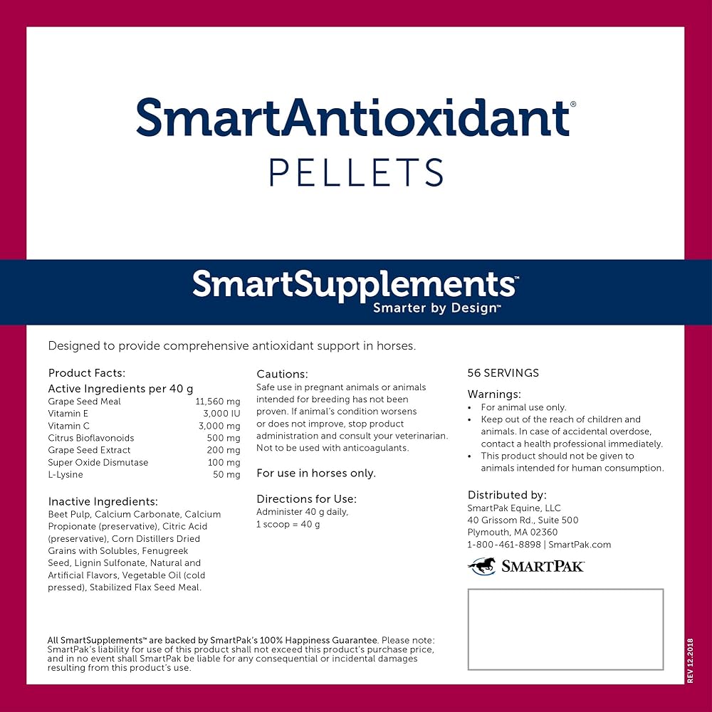 الدعم الكامل: الكريات عبارة عن مكمل شامل للحصان قد يساعد حصانك على مقاومة التأثيرات الضارة للإجهاد من خلال توفير فيتامين C وفيتامين E ومستخلص بذور العنب وSuper Oxide Dismutase للحصول على دعم خلوي شامل.