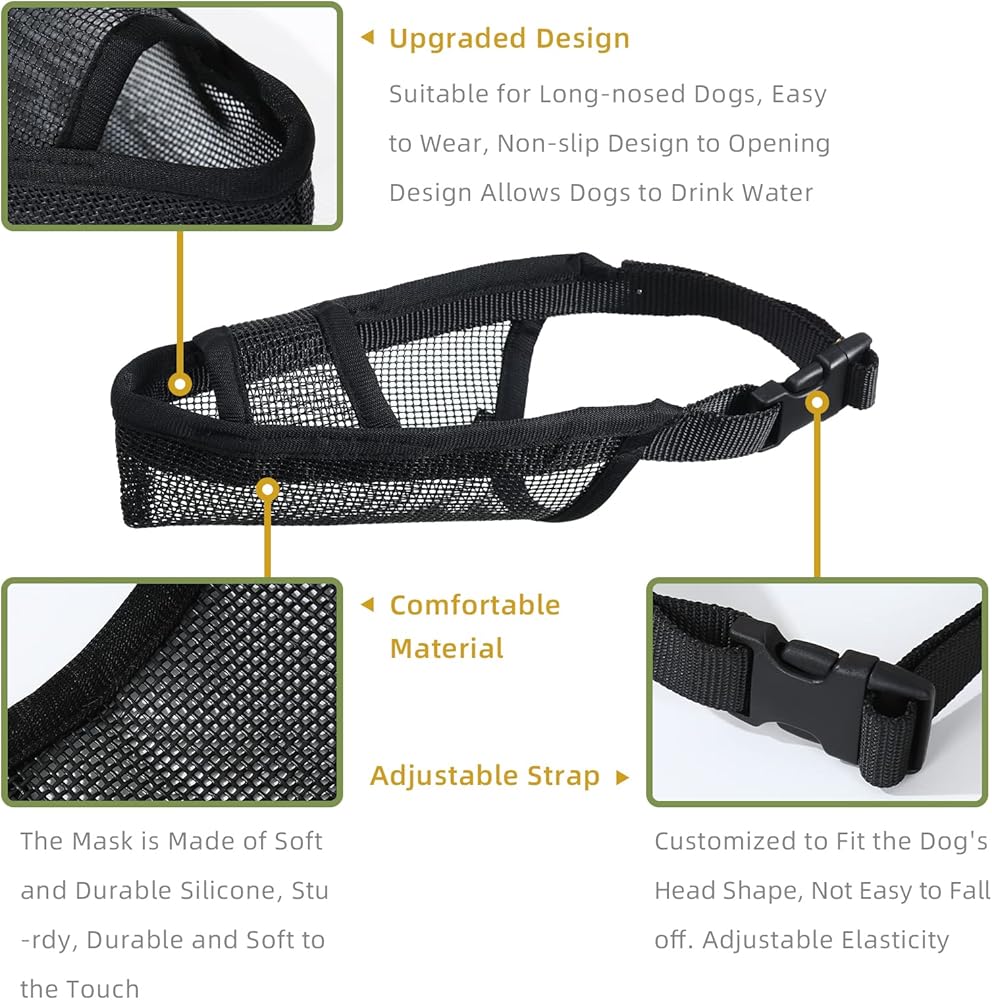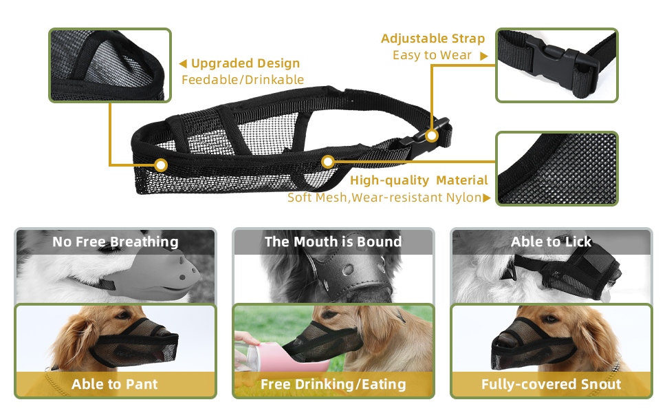 تصميم مثالي: كمامة ناعمة للكلاب ذات الأنف الطويل، سهلة الارتداء، تصميم مانع للانزلاق لمنع السقوط. يمكن لهذه الكمامات الشبكية للكلاب أن تمنع الكلاب من النباح والعض بشكل فعال. يسمح تصميم الفتحة الأمامية كمامة نباح الكلاب للكلاب بشرب الماء واللباس بحرية. أطواق كمامة الكلاب شبكية قابلة للتنفس، وأكثر خفة الوزن ومريحة، حتى في الصيف لن تشعر الكلاب بالحرارة.
