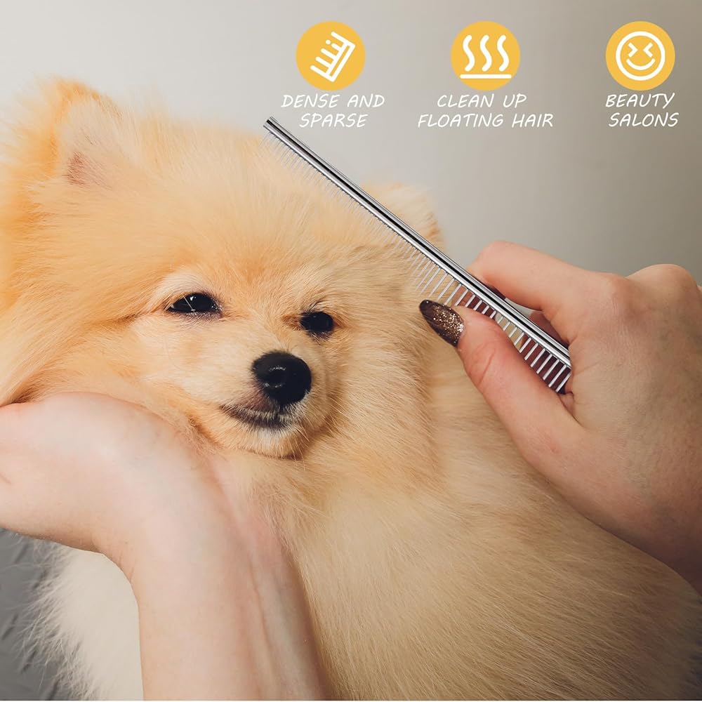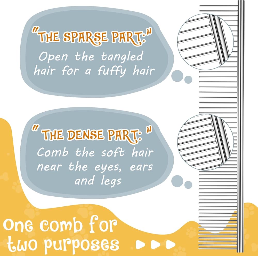 Dense and Wide Teeth Design: the cat comb has both dense and wide teeth; The dense teeth smoothly comb hair to ensure a tidy look while the wide teeth help remove tangles, mats, knots, and loose hair; The two in one design provides a comprehensive grooming solution for your pet