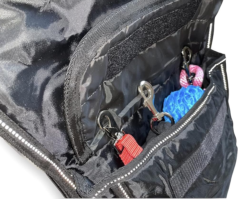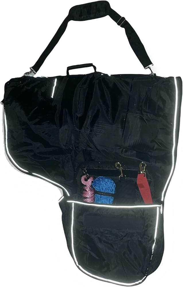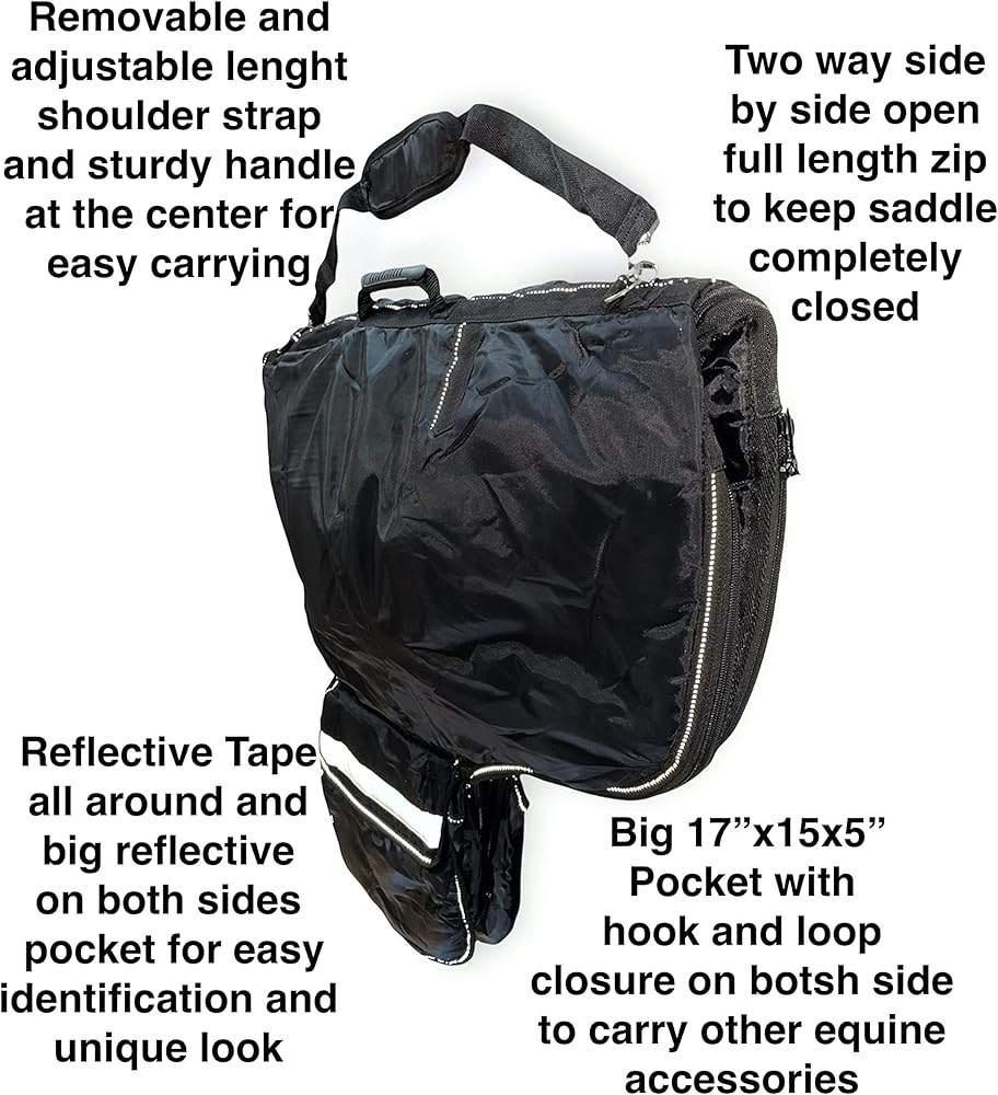 2 Big size pockets of 17"x15"X 5" with reflective and hook and loop closure to hold other tack items and accessories in addition to saddle and keep them in place so you don't miss them and keep all in one place while traveling..