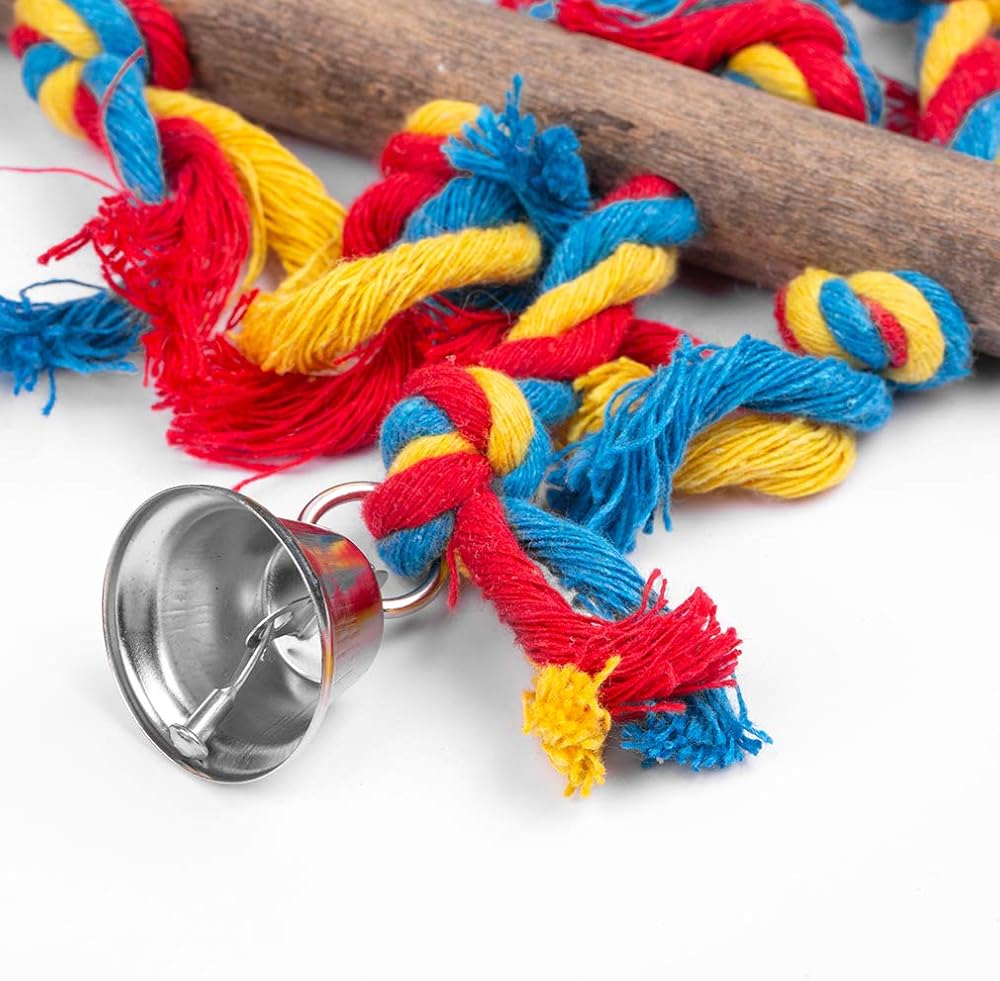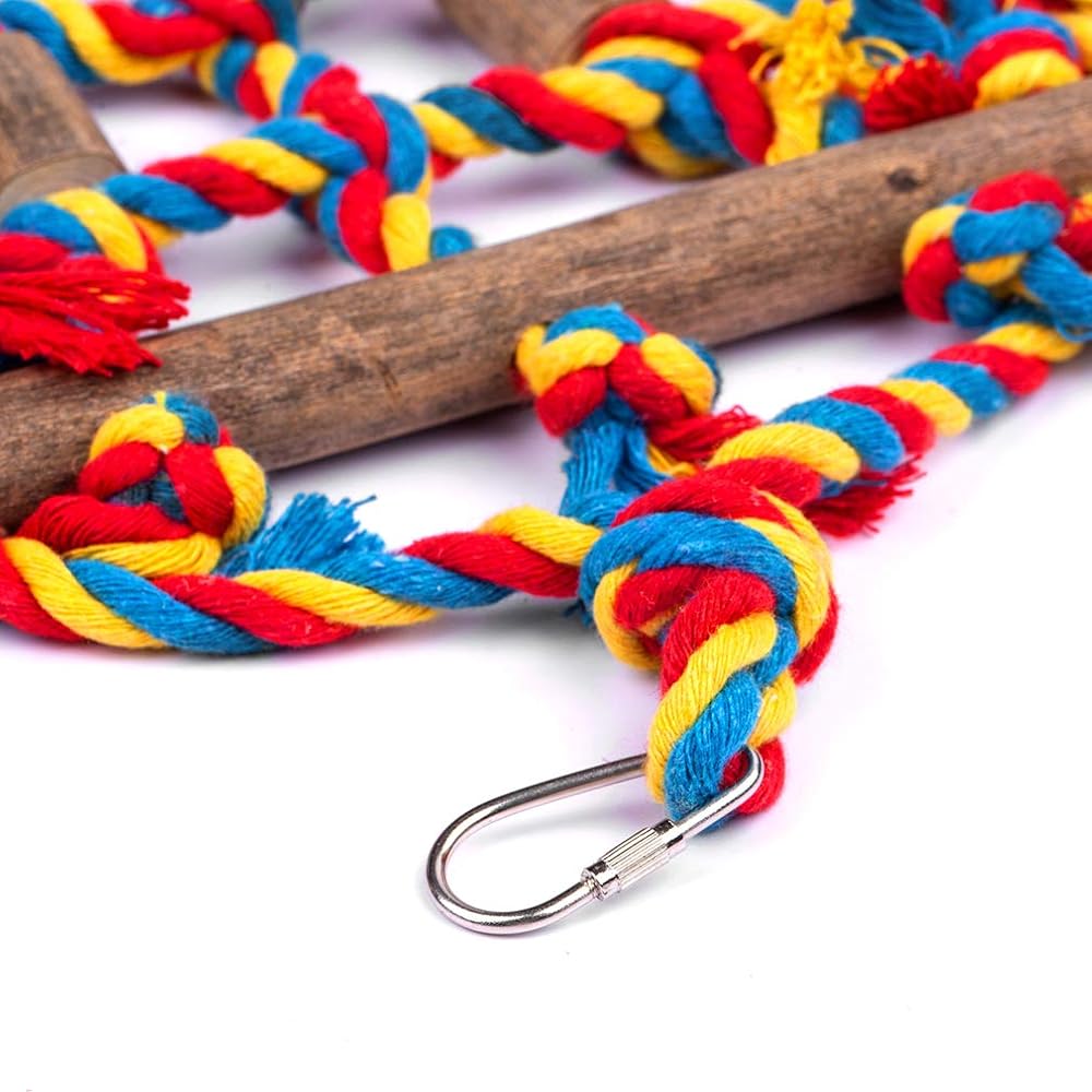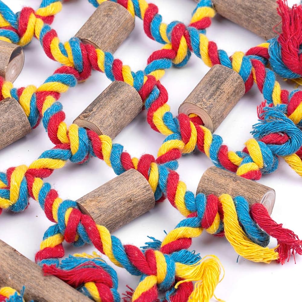 خشب طبيعي 100% -- كما ترون من صورتنا، تم تثبيتها على الحبال بقطع من الخشب الملون ليستمتع الببغاء الخاص بك بمضغها ومحاولة إزالتها للحصول على المزيد من المرح.