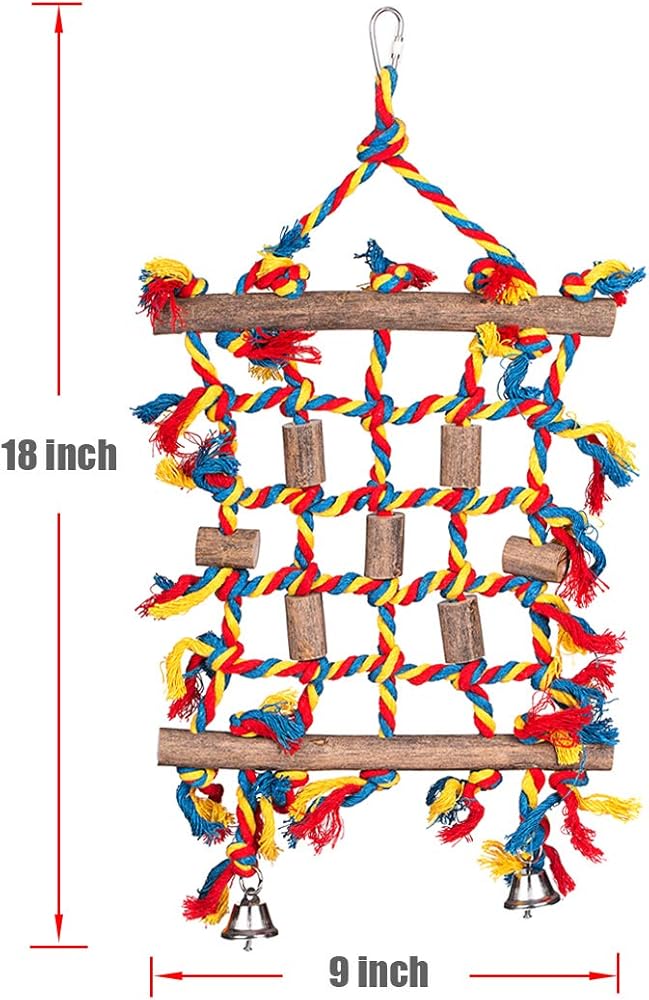 مقاسان لجميع أنواع الببغاوات - نقدم مقاسين لتلبية احتياجات الببغاء المختلفة. الحجم الصغير هو 9 بوصة عرضًا و18 بوصة طولًا مع الجرس، والحجم الكبير 17.7 بوصة عرضًا و31 بوصة ارتفاعًا مع جرس. لعبة مثالية للببغاء والكوكاتيل والمكاو والكونور فينش والكوكاتو والببغاء الرمادي الأفريقي وما إلى ذلك