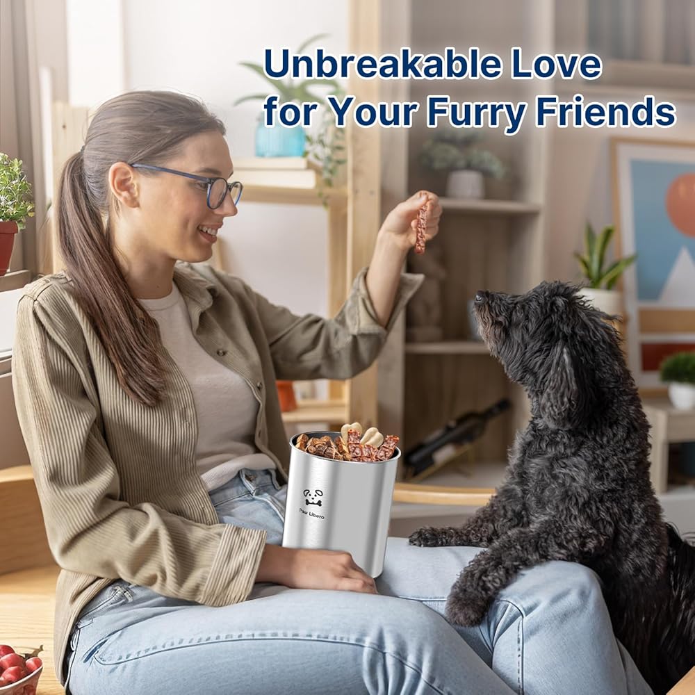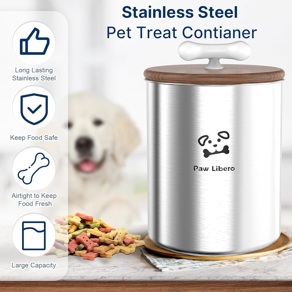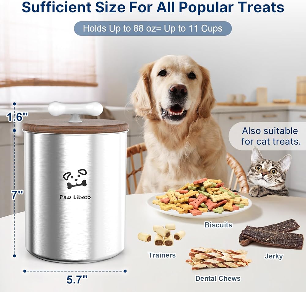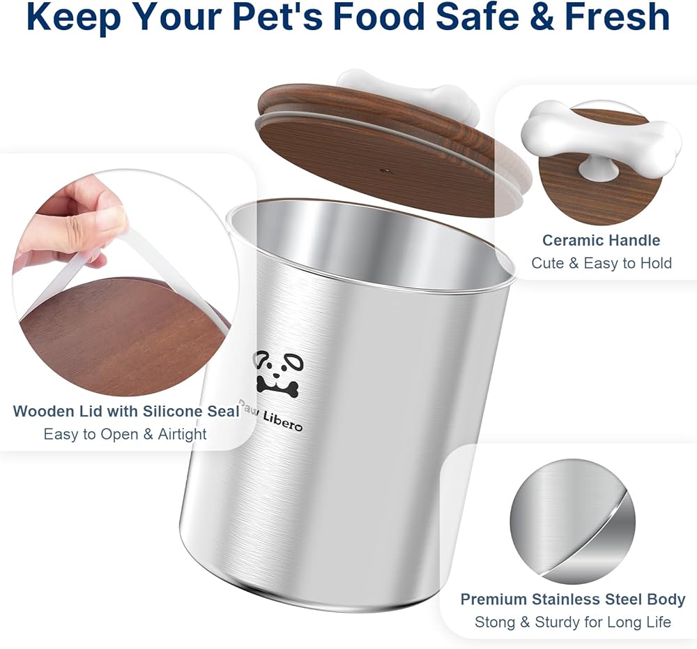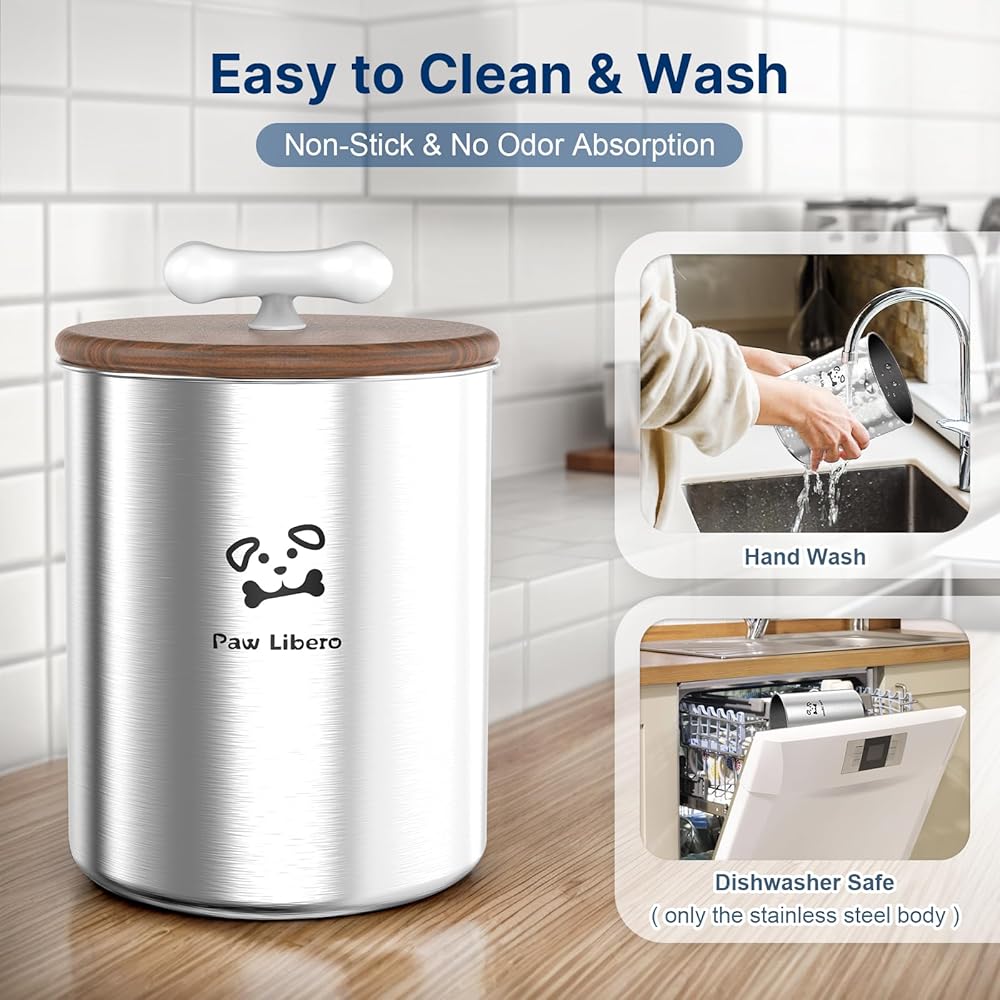 أغطية محكمة الغلق للحفاظ على المكافآت طازجة: حافظ على وجبة كلبك الخفيفة في ذروة نضارتها مع حاوية مكافآت الكلاب المصنوعة من الفولاذ المقاوم للصدأ ذات الغطاء الخشبي المحكم! تساعد الأغطية الخشبية ذات البطانة المطاطية محكمة الغلق على الحفاظ على مذاق مكافآت الكلاب مع الحفاظ على الضوء والرطوبة من أجل النضارة. حاويات الحلوى ذات الأغطية للحيوانات الأليفة ذات مقابض على شكل عظمة لسهولة الفتح وأنيقة.