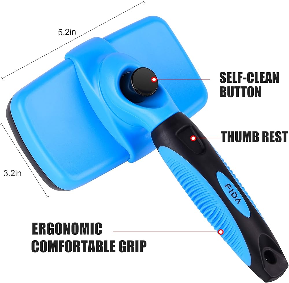 ★ فرشاة مثالية لإزالة كل الأشياء السيئة من فراء حيوانك الأليف - تعمل فرشاة Fida ذاتية التنظيف على إزالة الشعر السائب بلطف، وتزيل التشابك والعقد والوبر والأوساخ العالقة. يعمل بشكل رائع على جميع أحجام الكلاب والقطط ذات الشعر الطويل أو القصير.