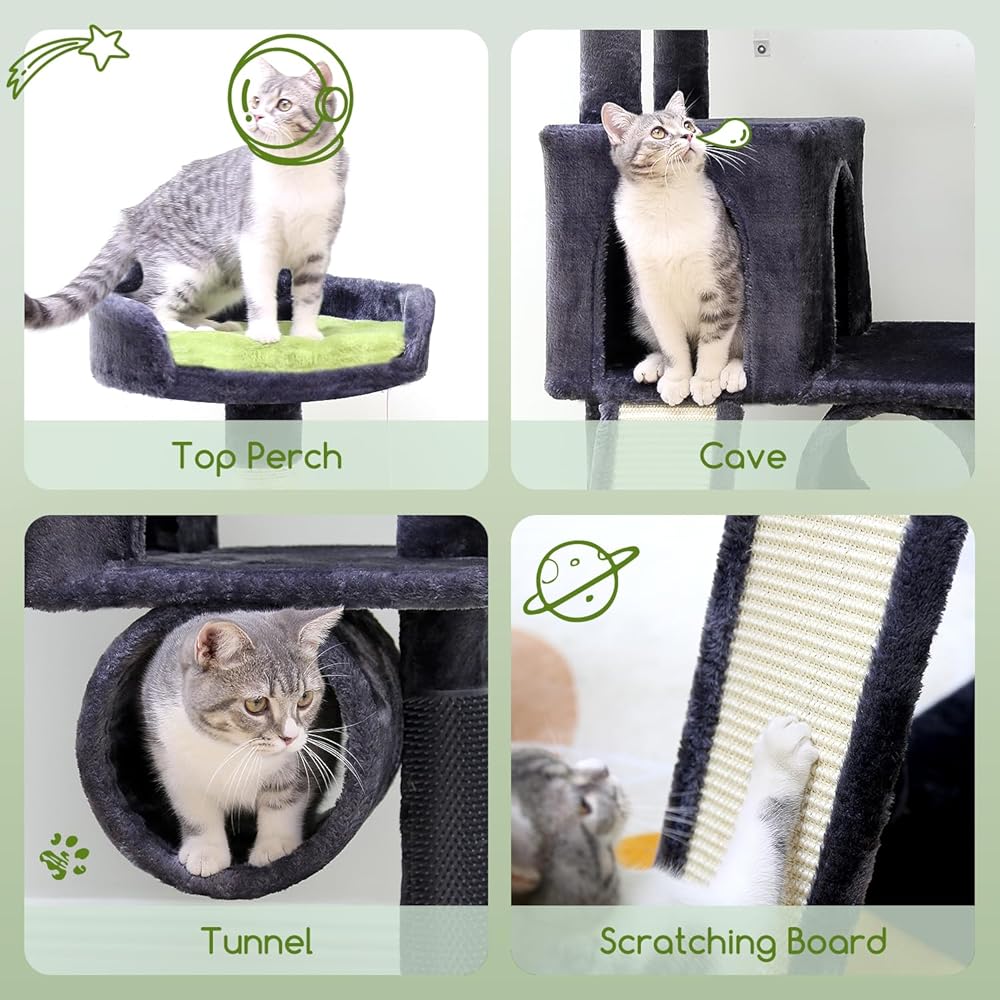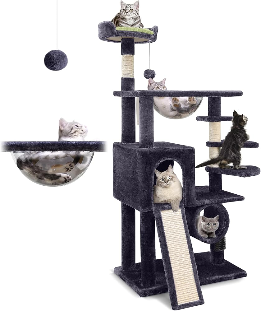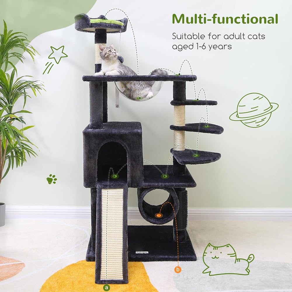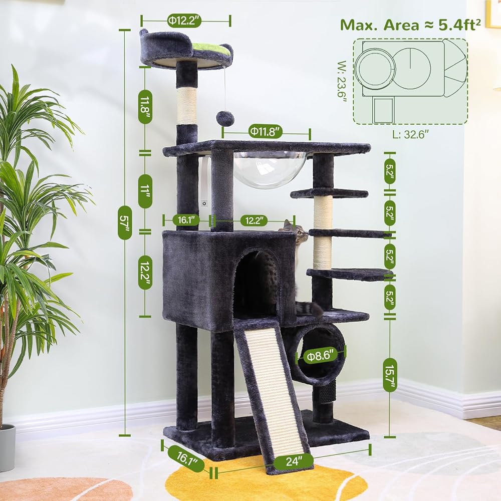 F57 عمود خدش شجرة القطط، خصيصًا للقطط الشجاعة، برج شجرة القطط طويل القامة 57 بوصة، نفق، عش كبسولة الفضاء، لوح خدش السيزال، مسكن القطط، مساحة صغيرة لشجرة القطط، رمادي داكن