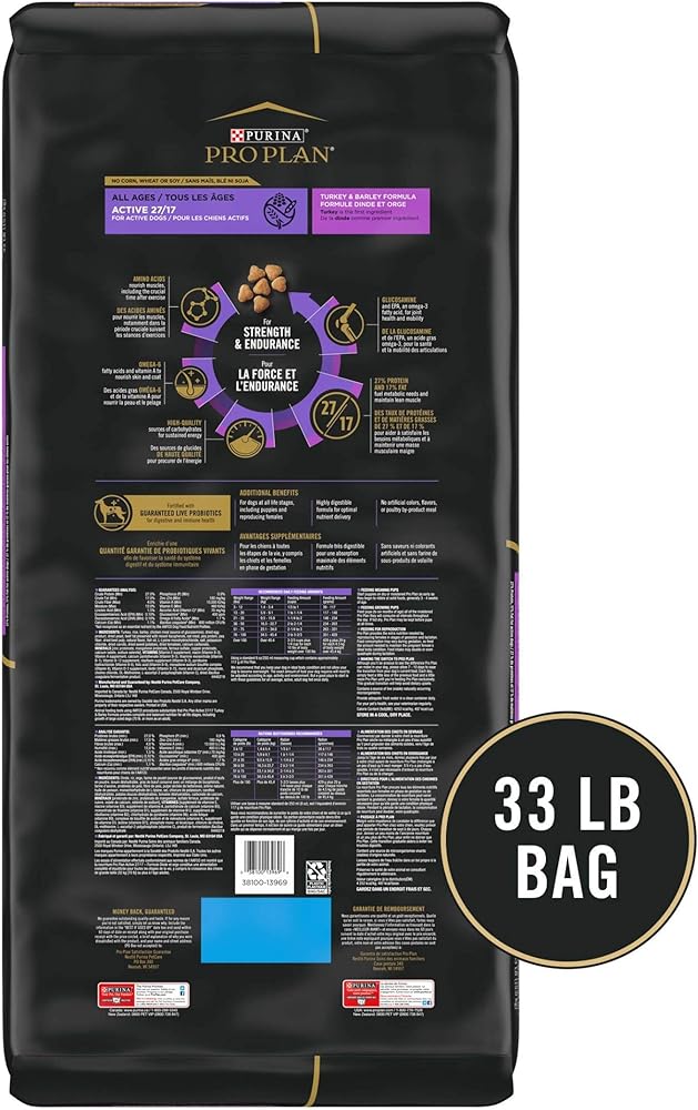 Give your dog the nutrition he needs to excel with Purina Pro Plan Brand Dog Food Active 27/17 Chicken and Rice Formula dry dog food. Including chicken as the first ingredient, this high protein dog food helps to promote total body health. The highly digestible dog food formula helps promote optimal nutrient delivery to support active dogs, whether they enjoy running by your side or taking long walks. With 27 percent protein and 17 percent fat to help maintain lean muscle and an ideal body condition, and rich in antioxidants to help support your dog's healthy immune system, this Purina Pro Plan dog food helps you care for his overall health every time you fill his dish. Each serving of Purina Pro Plan Active 27/17 offers 100 percent complete and balanced nutrition throughout every stage of his life, so he can enjoy the food he loves from his playful puppy days all the way up to his senior years.