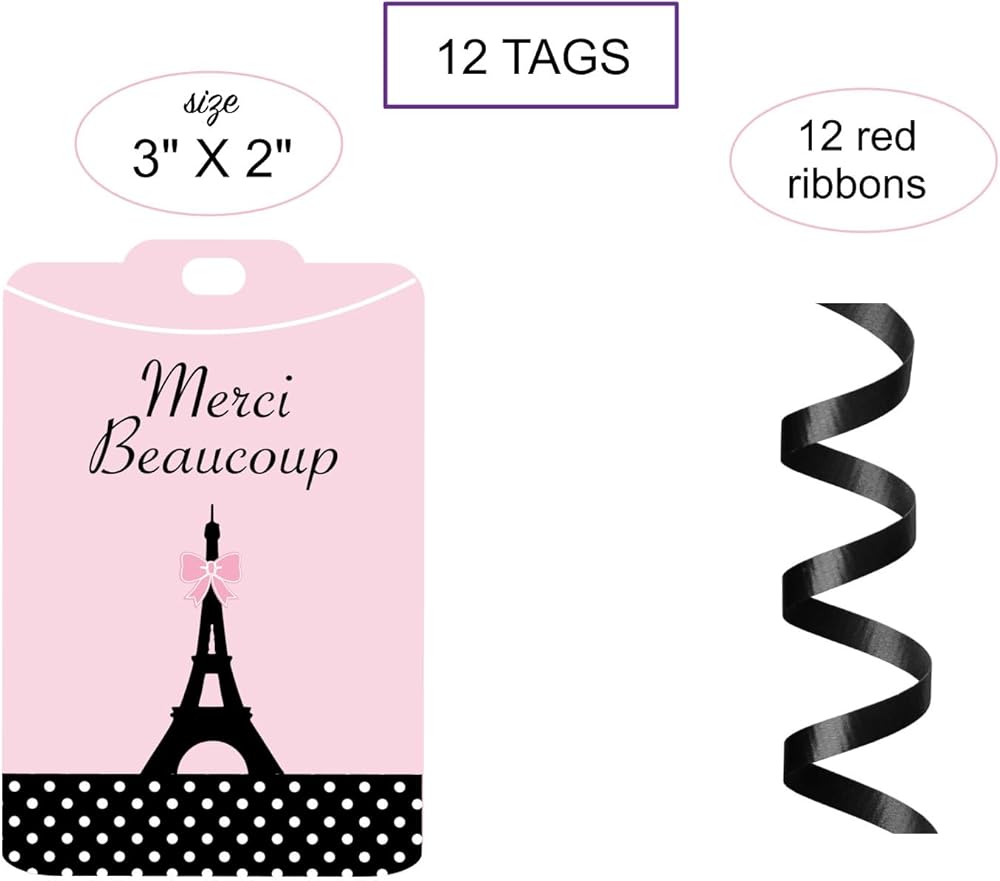 Embrace the elegance of Paris with our "Merci Beaucoup" Paris Eiffel Tower Thank You Tags! This 12-pack of thank you tags is designed to add a touch of French charm to your appreciation messages. With their 3" x 2" size, they are the perfect addition to gifts, favor bags, and more. Show your gratitude with the allure of Paris using our "Merci Beaucoup" Paris Eiffel Tower Thank You Tags. Order your 12-pack today and let the elegant black and pink colors transport your recipients to the enchanting streets of Paris.
