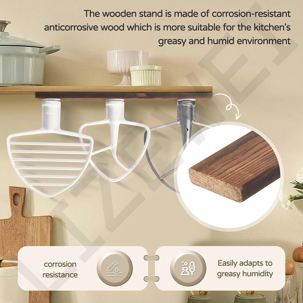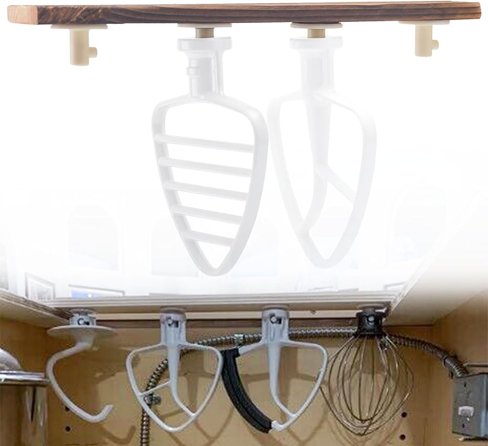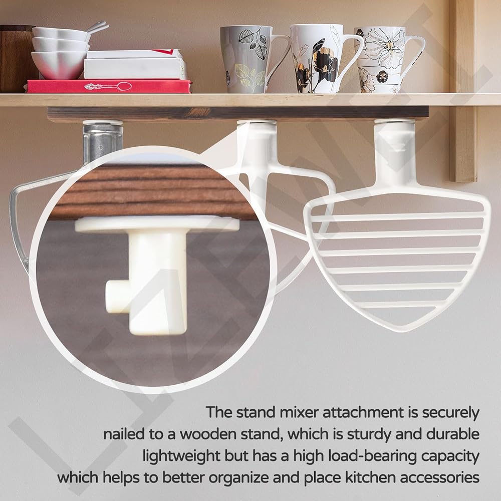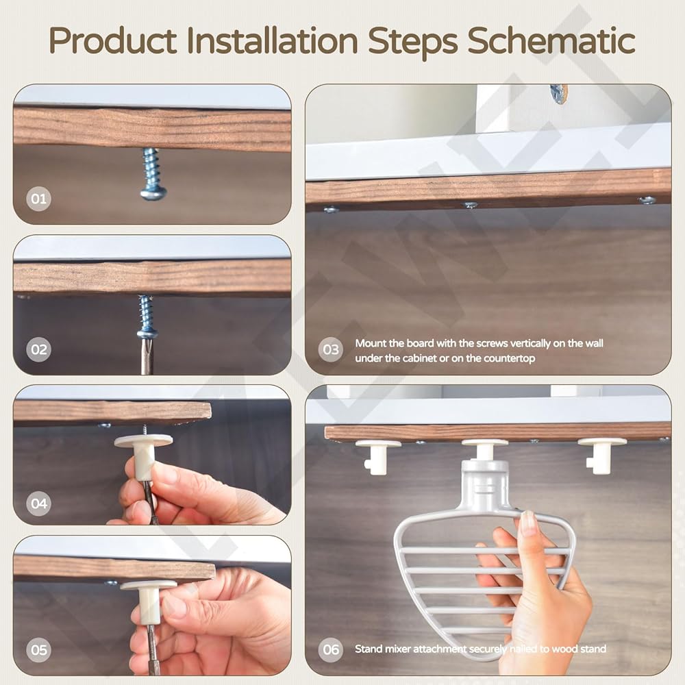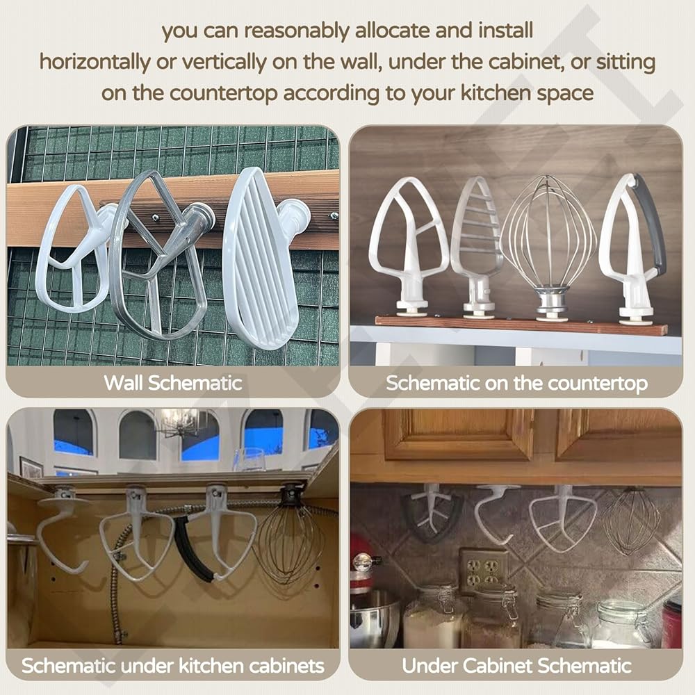 Installation: you can reasonably allocate and install horizontally or vertically on the wall, under the cabinet, or sitting on the countertop according to your kitchen space. The stand mixer attachment is securely nailed to the wooden bracket that holds up to 4 mixer attachments.