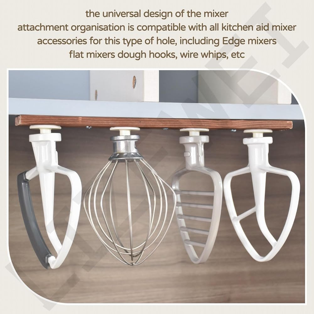 Wide Range of Uses: the universal design of the mixer attachment organisation is compatible with all kitchen aid mixer accessories for this type of hole, including Edge mixers, flat mixers, dough hooks, wire whips, etc.