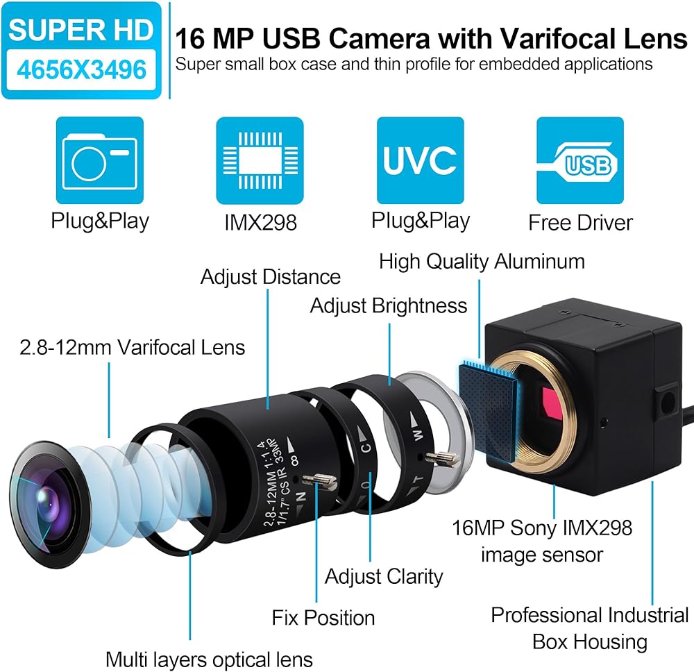 QILOVE كاميرا USB 16 ميجابيكسل تكبير يدوي 2.8-12 مم عدسة كاميرا ويب 16 ميجابكسل CMOS IMX298 UVC USB2.0 كاميرا ويب مدمجة لشريط الطابعة ثلاثية الأبعاد / مسح رمز الاستجابة السريعة