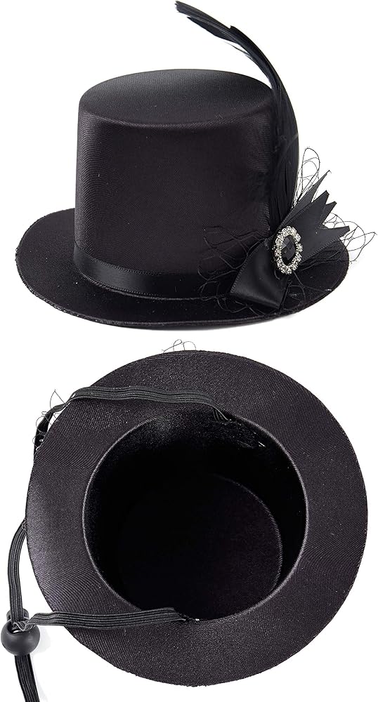 Design: it is a top hat decorated with sparkle crystals rhinestones and black feather, while the strap can be fastened easily under your pet's chin and helps keep it in place.