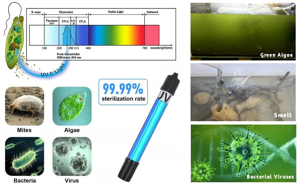 【تقليل الرائحة】 يمكن لضوء تنظيف حوض السمك أن يقلل من الرائحة في حوض السمك، بمجرد أن يمتلئ حوض السمك باللون الأخضر سوف يكون مصحوبًا برائحة سيئة، يمكن أن يقلل ضوء حوض السمك النظيف هذا من الرائحة في حوض السمك.