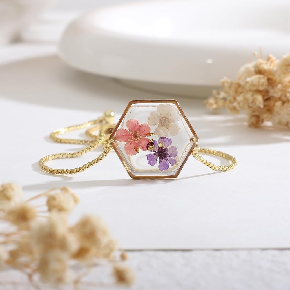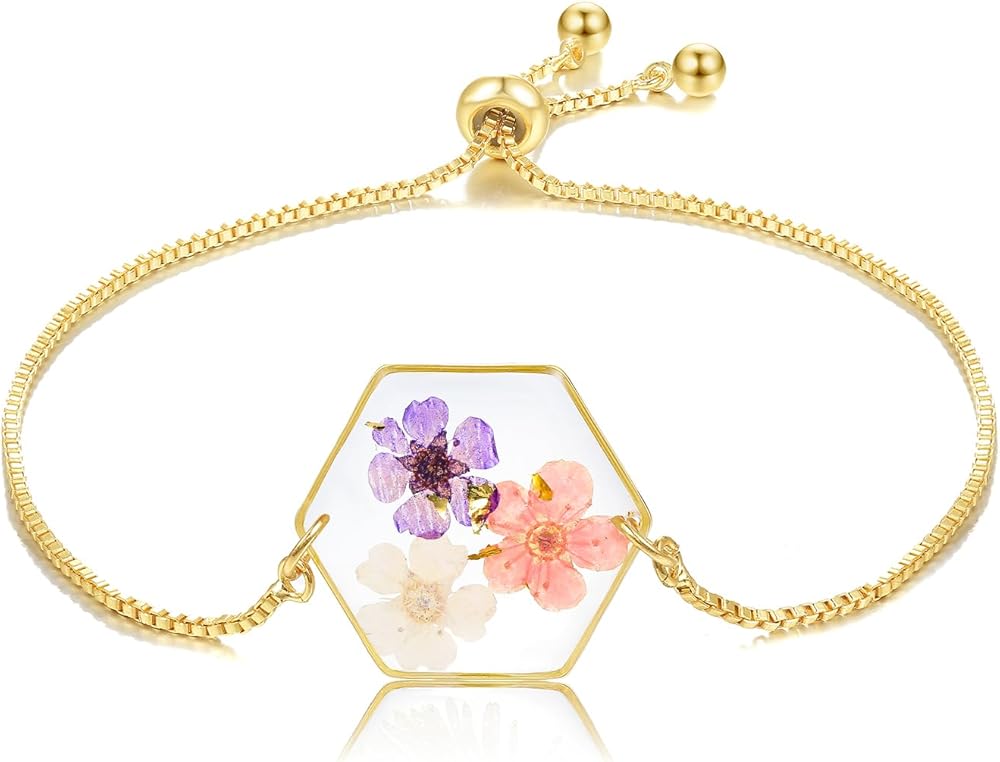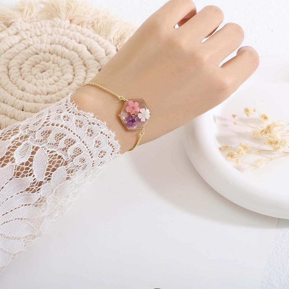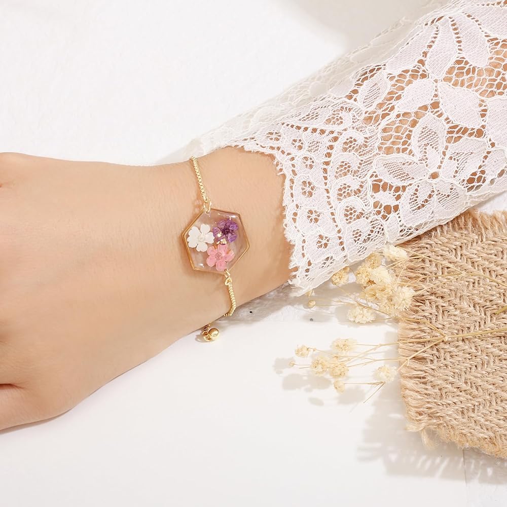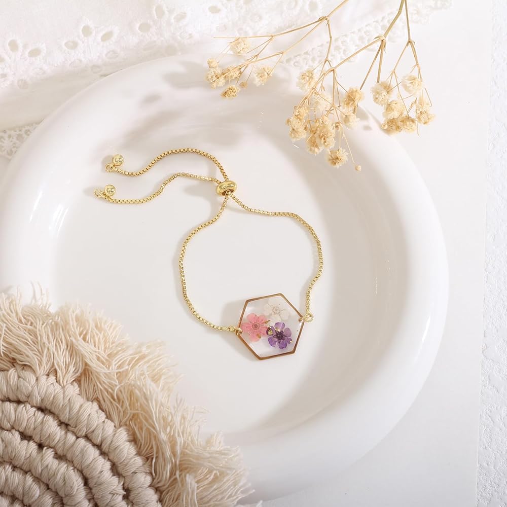 Our Pressed Flower Bracelets are made from a variety of beautiful, natural dried flowers. Each bracelet is truly one of a kind, just like you. The bracelets are adjustable, so one size fits all. Each bracelet will come with 2-4 different types of dried flowers. The flowers are naturally dried, so each bracelet may have slight variations in color and shape.