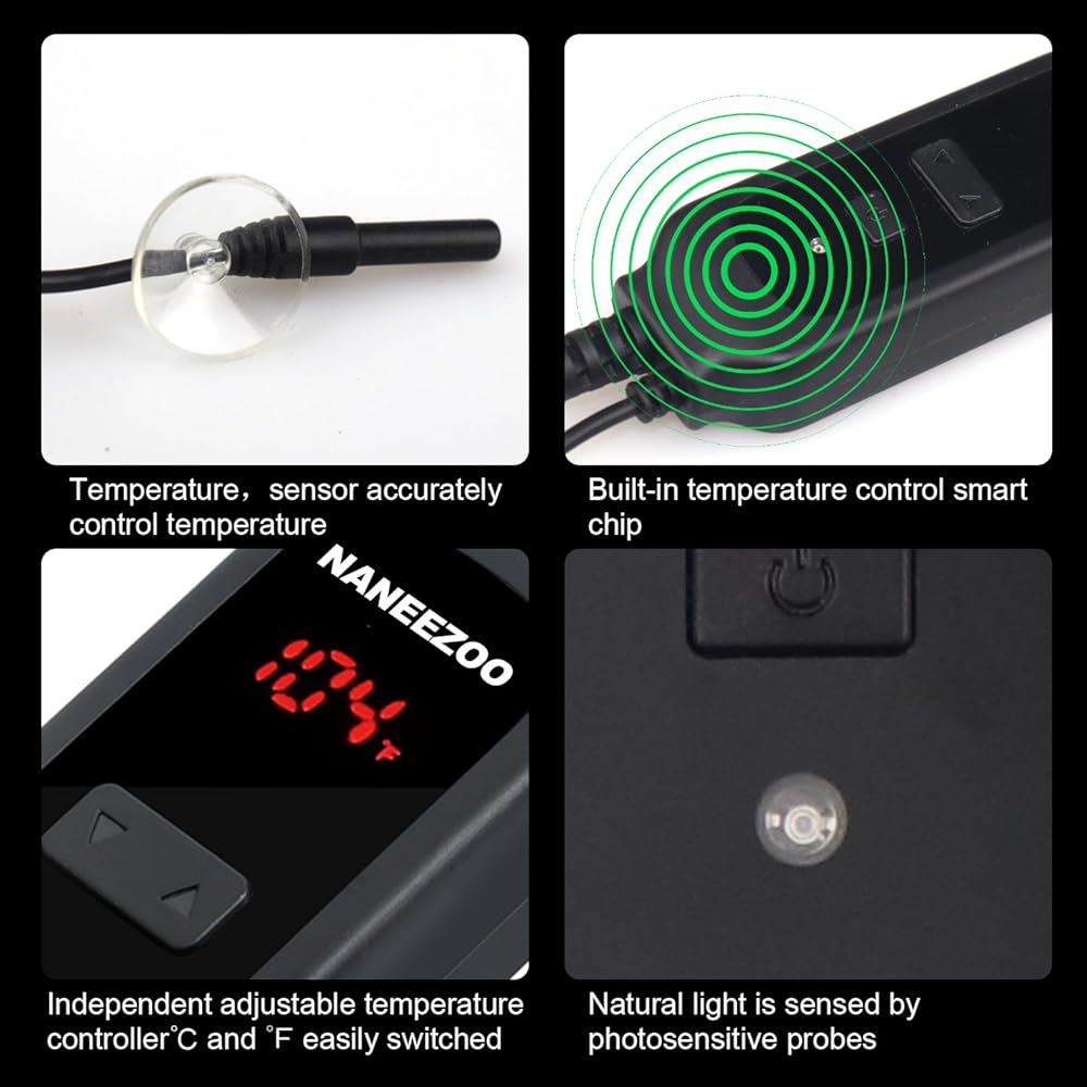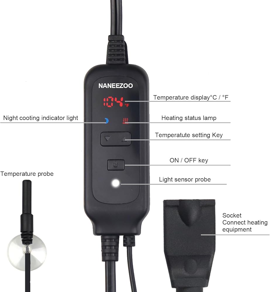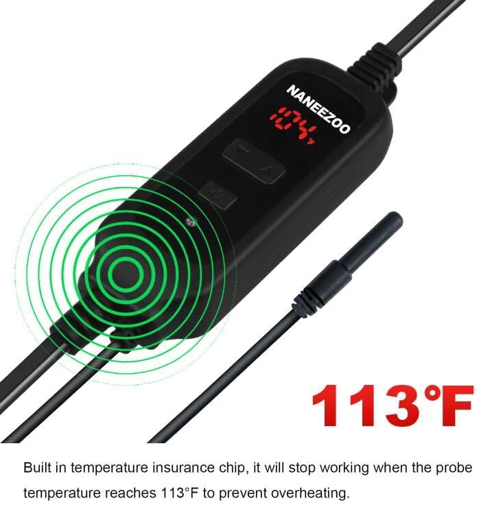 [السلامة والموثوقية] منظم الحرارة الرقمي NANEEZOO مزود بمستشعر دقيق للغاية يمكنه الكشف بحساسية عن درجة الحرارة في الوقت الحقيقي وإجراء التعديلات. يتراوح نطاق التحكم الثابت في درجة الحرارة من 20 درجة مئوية إلى 45 درجة مئوية (68 درجة فهرنهايت إلى 113 درجة فهرنهايت). رقاقة تأمين مدمجة لدرجة الحرارة، ستتوقف عن العمل عندما تصل درجة حرارة المسبار إلى 113 درجة فهرنهايت لمنع ارتفاع درجة الحرارة.