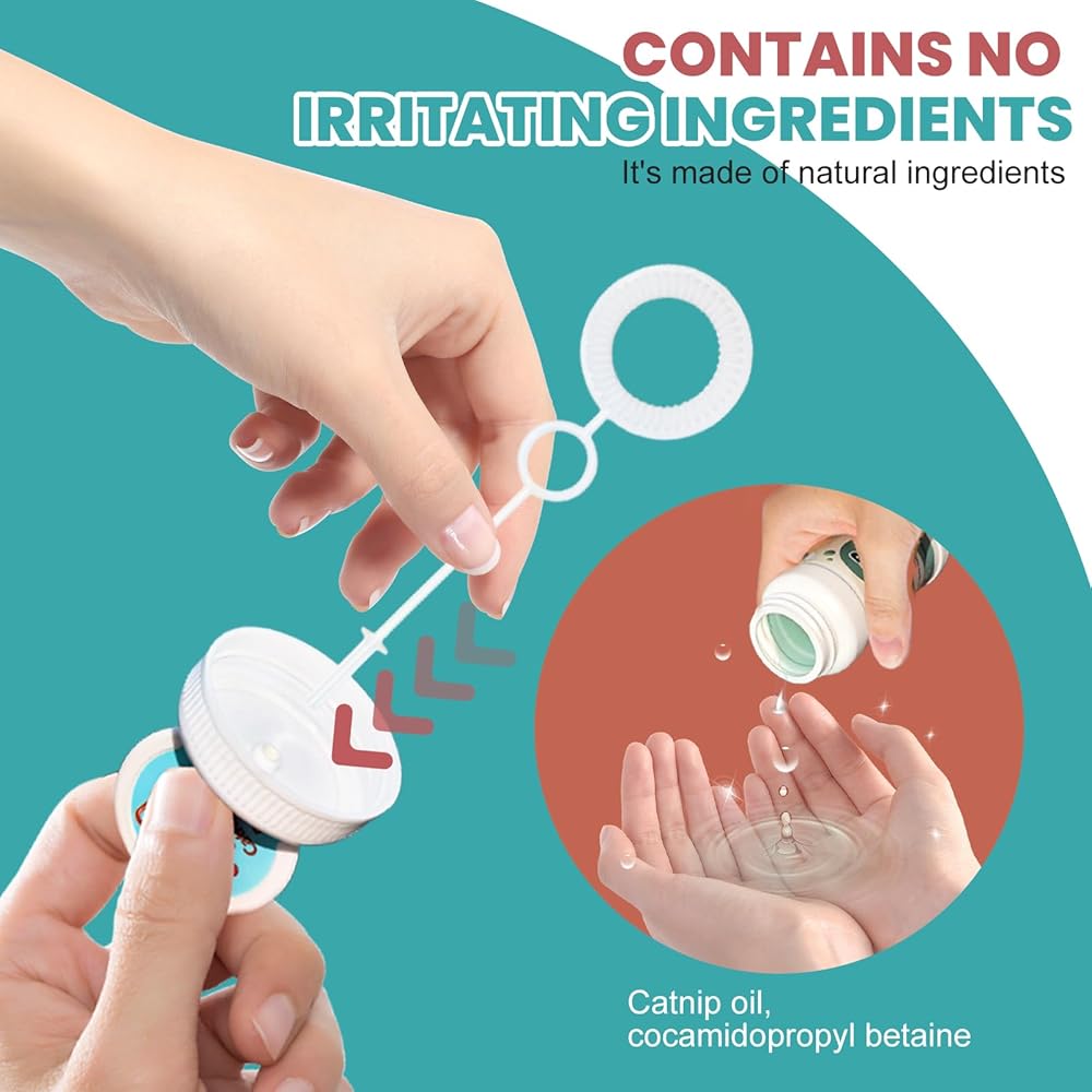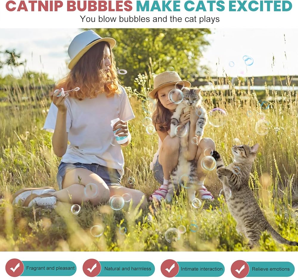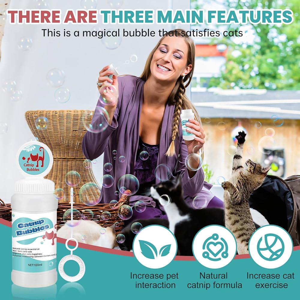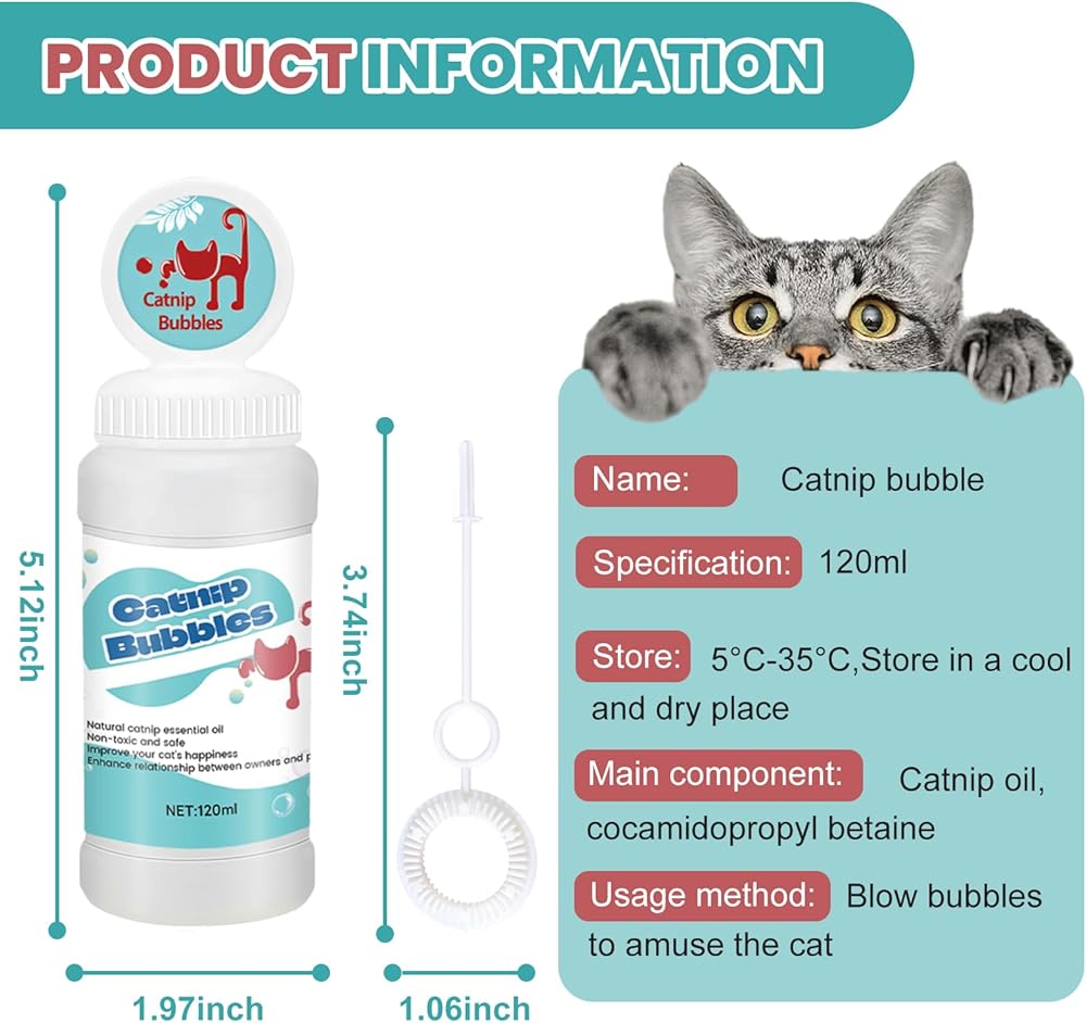 【Enhances Bonding】 Catnip bottles come with a bubble blowing tool.Playing with cat bubbles water not only increases your cat's activity but also strengthens the bond between you and your cat, fostering a closer relationship.
