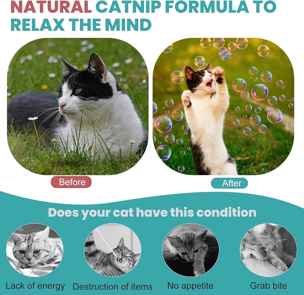 【Stimulates Playfulness】Catnip has natural calming effects that help alleviate your cat's stress and anxiety, keeping them happy and relaxed. The catnip bubbles for indoor cats excites your cat's interest, making them more active and eager to play with the bubbles.