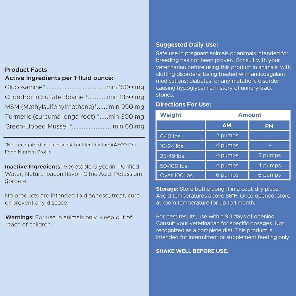تحتوي كل زجاجة على 16 أونصة. من الجلوكوزامين السائل بنكهة لحم الخنزير المقدد للكلاب. كما يأتي مع غطاء مضخة اختياري لسهولة القياس والتقديم. ما عليك سوى ضخه في طعام كلبك ومشاهدته وهو يستمتع به!