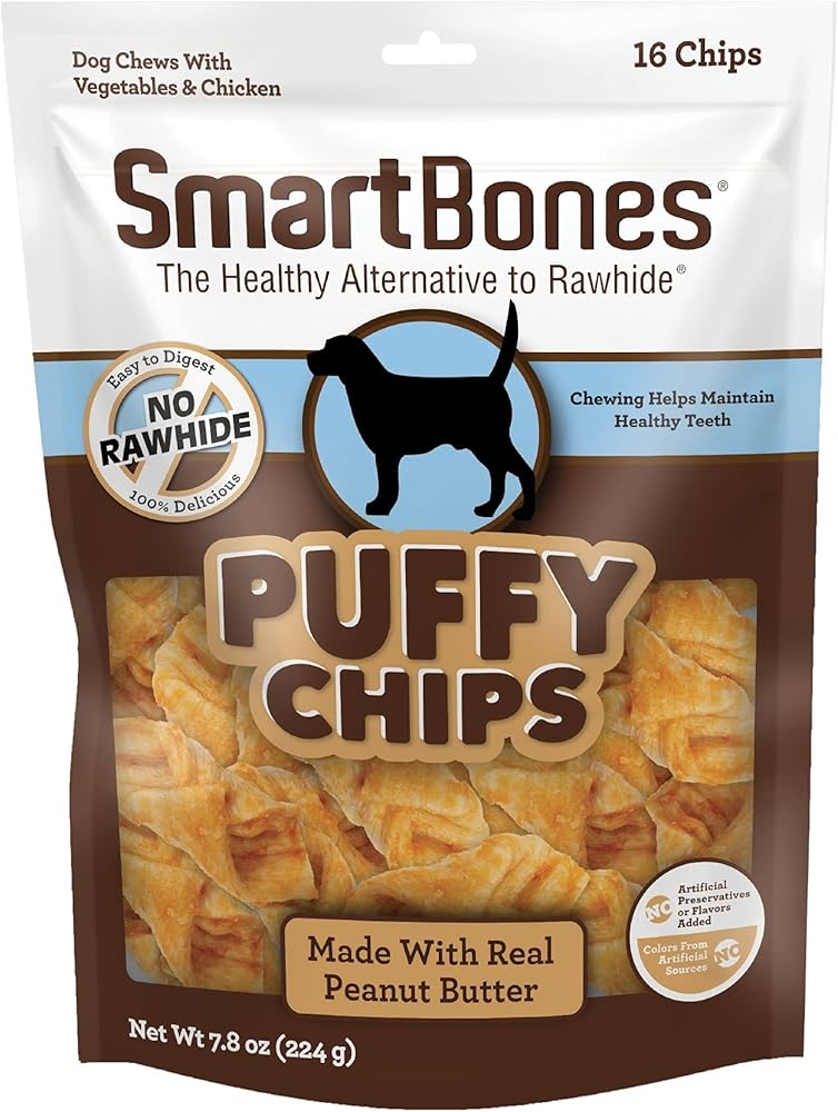 MADE WITH REAL PEANUT BUTTER: SmartBones Puffy Chips are made with wholesome vegetables, real chicken and peanut butter for a scrumptious taste your dogs can't resist!