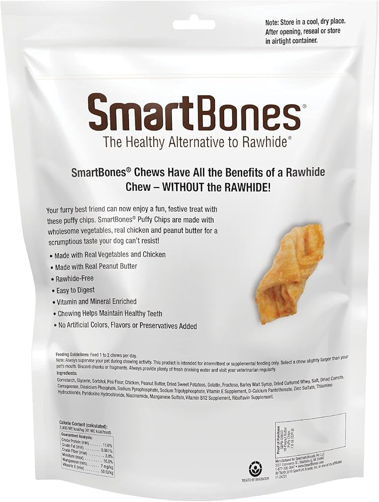 SmartBones chews have all the benefits of a rawhide chew…without the rawhide! No-rawhide SmartBones chews are made with wholesome vegetables and chicken for a scrumptious taste dogs can't resist. Your furry best friend can now enjoy a fun, festive treat with these puffy chips. Made with craveable ingredients like wholesome vegetables, real chicken and peanut butter, these SmartBones Puffy Chips are sure to be a new favorite for your dog. Plus, they're made with no artificial preservatives, flavors or colors added, so you can feel good about feeding these delicious chews to your pup. Giving your dog a treat that you both love just got a whole lot easier! A healthy alternative to rawhide, these vitamin and mineral enriched chews are easy to digest while still satisfying your dog's natural urge to chew. Chewing helps maintain healthy teeth. Feed your dog 1 to 2 chews per day. Always supervise your pup during chewing activity. These chews are for intermittent or supplemental feeding only. Select a chew slightly larger than your pet's mouth. Discard chunks or fragments. Always provide plenty of fresh drinking water and visit your veterinarian regularly. Store in a cool, dry place. After opening, reseal or store in an airtight container to preserve freshness.