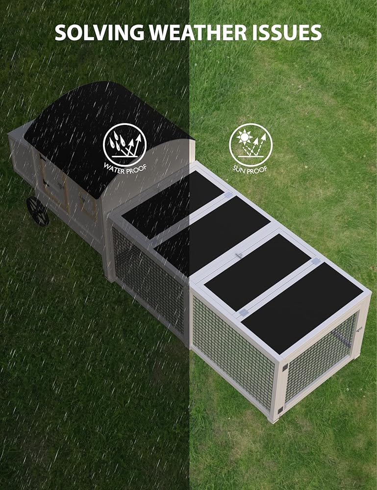 Weather-resistant Roof: This outdoor rabbit cage chicken coop is equipped with a durable asphalt roof that provides UV protection during sunny days and waterproofing on rainy days, ensuring suitability for various weather conditions.