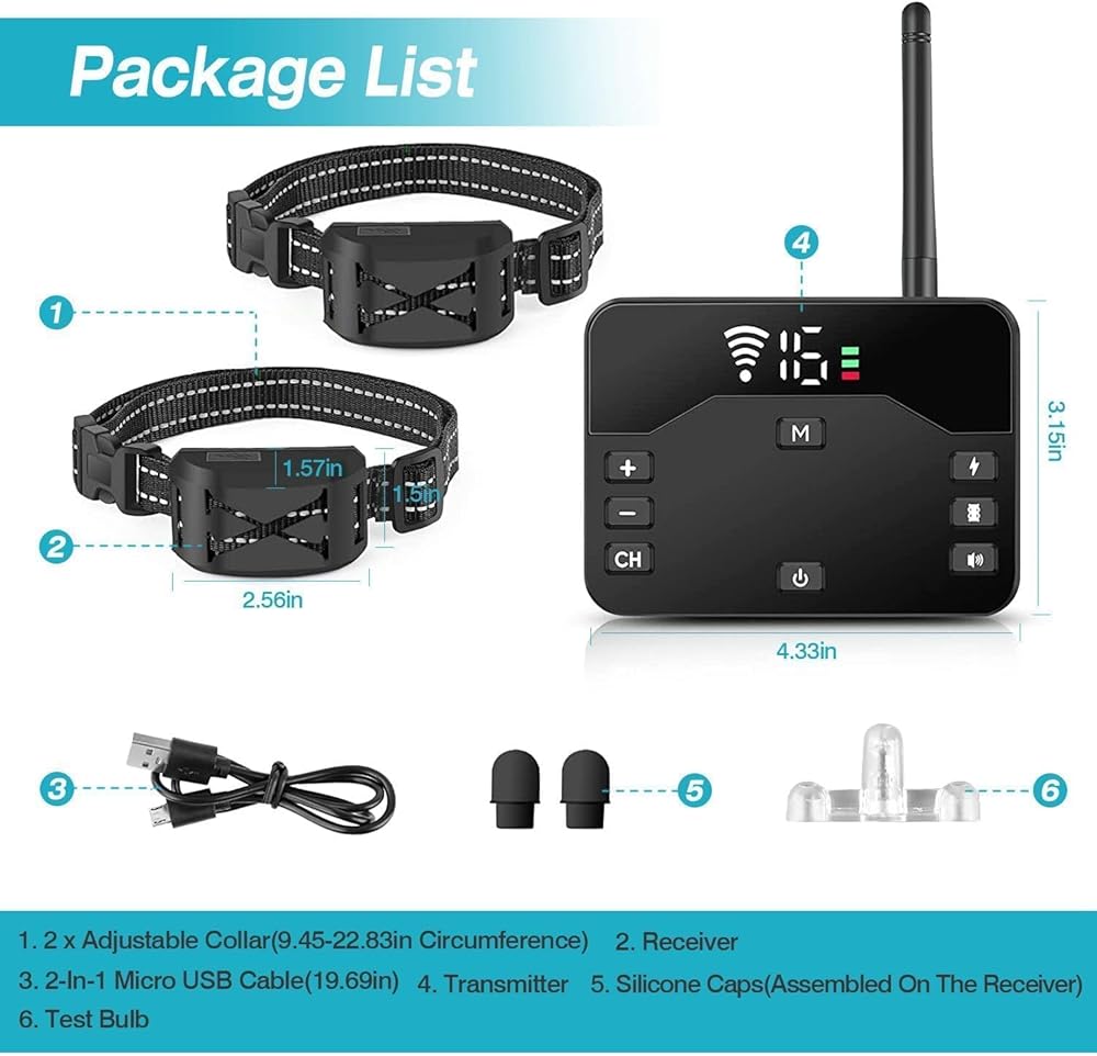 【شحن سريع وعمر بطارية أطول】- أطواق جهاز الإرسال والاستقبال قابلة لإعادة الشحن. يوفر طوق جهاز الإرسال والاستقبال هذا عمر بطارية يدوم لفترة طويلة، ويستغرق شحنه بالكامل ساعتين فقط. يمكن لجهاز التحكم عن بعد لأطواق الصدمات الخاصة بالكلاب أن يستمر لمدة تصل إلى 30 يومًا من زمن الانتظار! من المتوقع أن يعمل وضع السياج الإلكتروني للاستخدام لفترة طويلة لمدة أسبوع تقريبًا. يوصى بإيقاف تشغيل الجهاز عند عدم استخدامه لتوفير عمر البطارية.