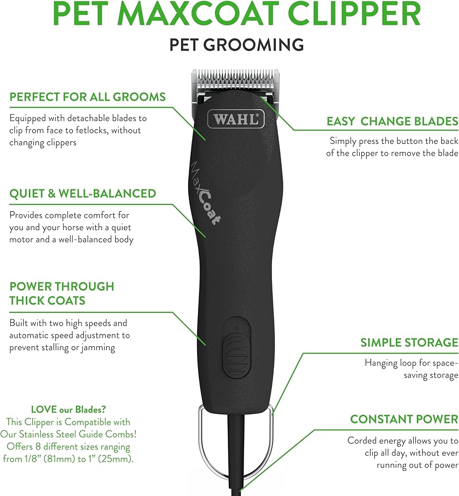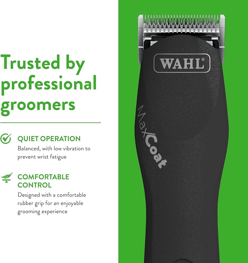 • ماكينة قص قوية للحيوانات الأليفة: تم تصميمها لقص أي شيء تقريبًا، ماكينة Wahl Professional MaxCoat Clipper تتحكم بسهولة في شعر الحيوانات الأليفة والحصان السميك.