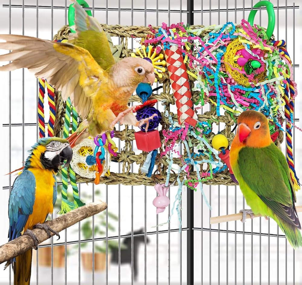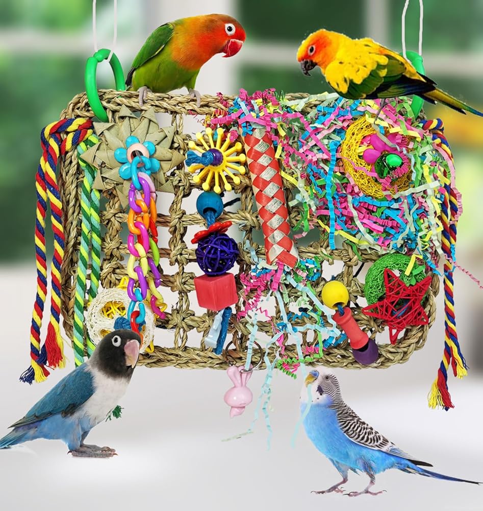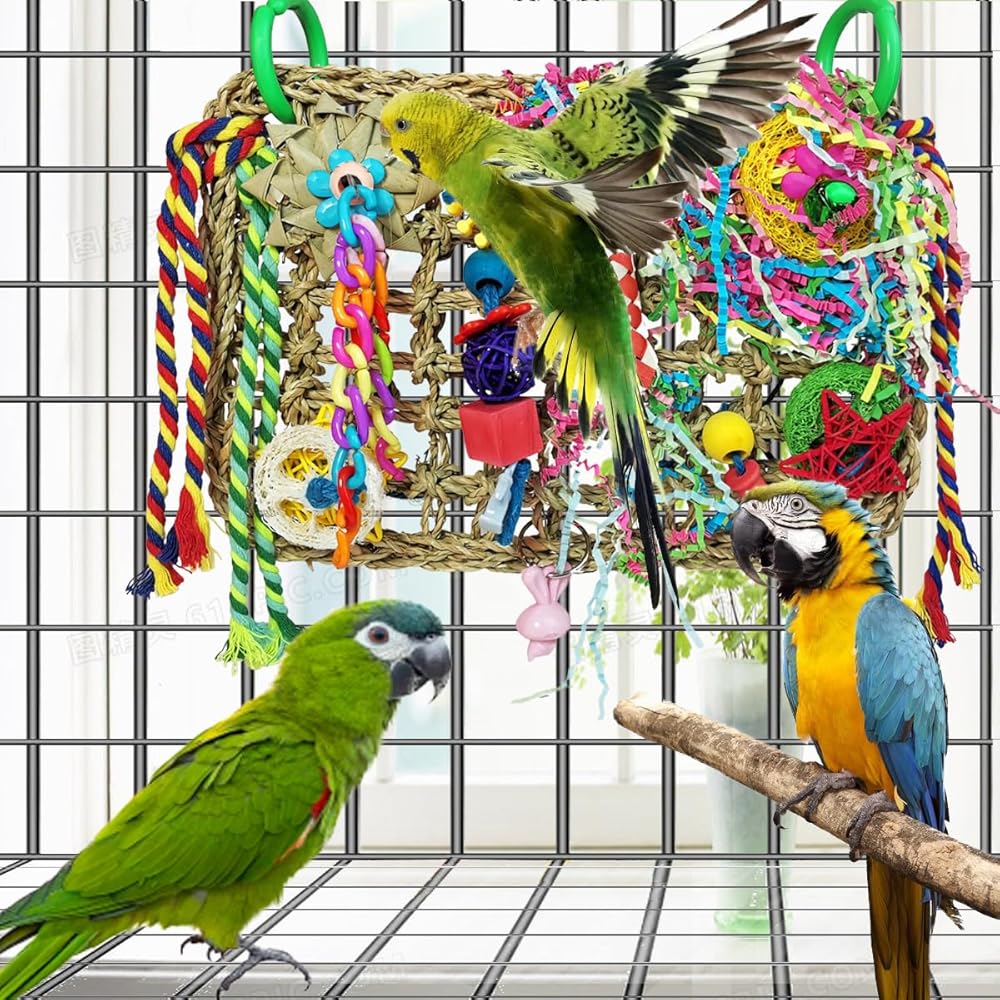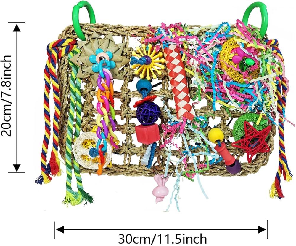 【Perfect Design】This bird woven toy mat is designed not only to stimulate birds' natural instincts of chewing and foraging, but also to prevent them from feeling lonely and depressed, so that they can stay happy and healthy. The bird chew toys on the climb mat can be removed or rearranged for your liking, or add cuties' favorite toys
