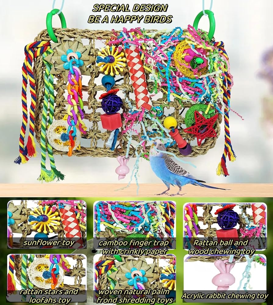 【Safe Material】Bird climbing mat set includes various bird toys, Made of natural seagrass, crinkly paper, rattan stars, loofahs, wooden blocks, acrylic little rabbit and trojan horse. The bird foraging toys are tightly woven with various chewing pecking toys for birds.