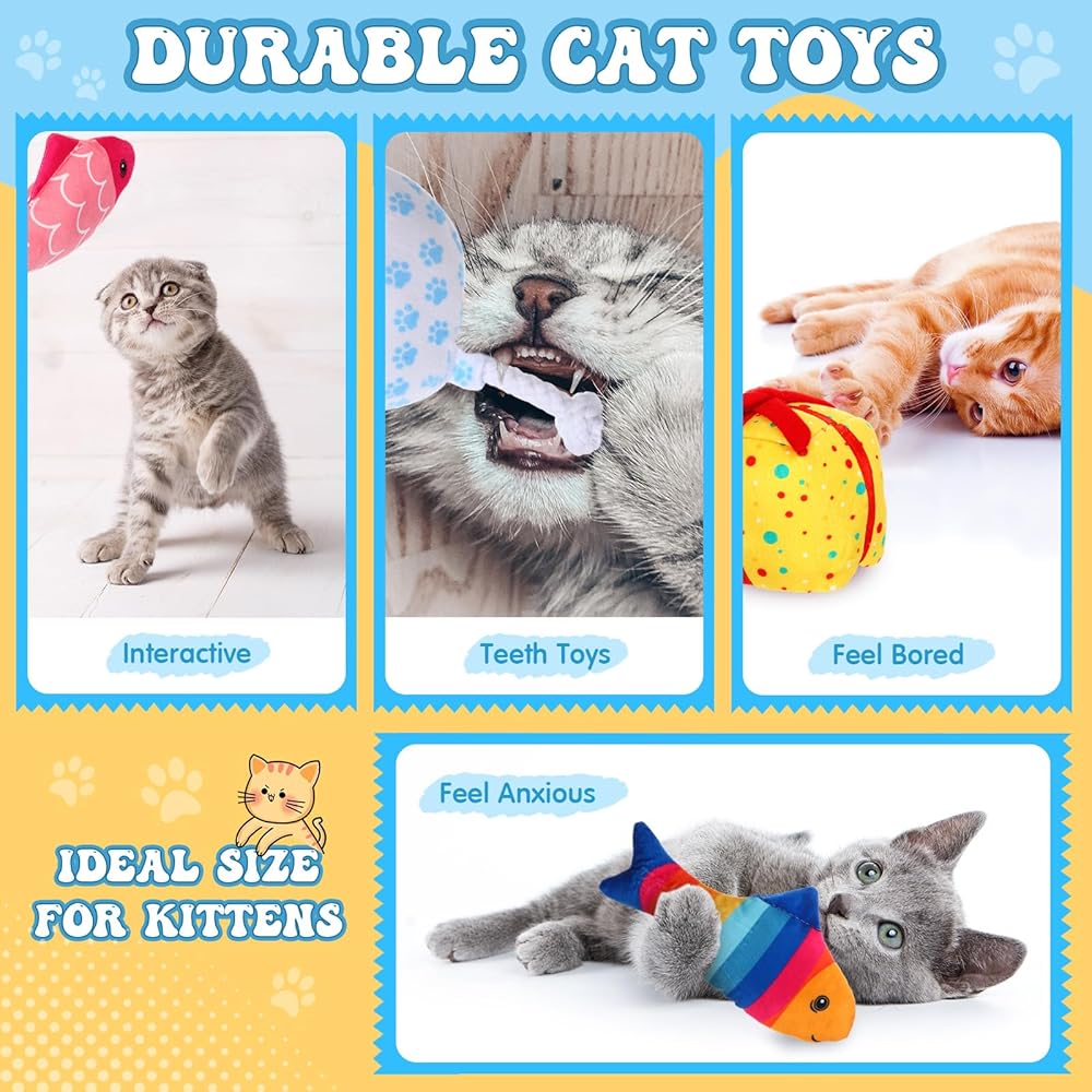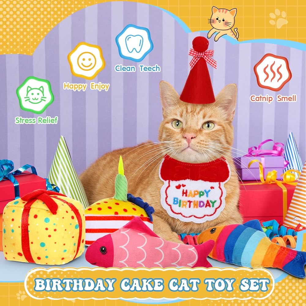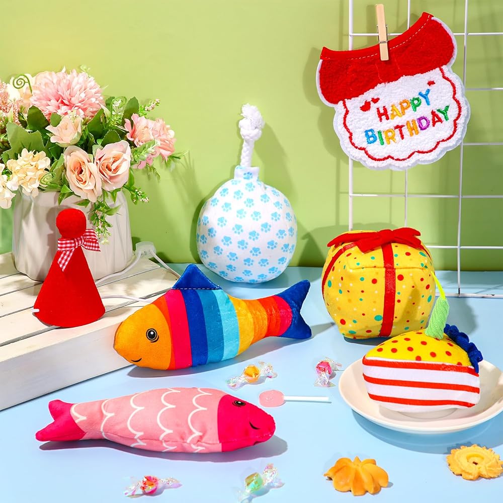 Regardless of your pet's size, our birthday cat toys are certainly suitable, with proper sizes of toys, including about 2.95 x 2.48 inches of box shape, about 7.48 x 3.15 inches of balloon shape, about 3.54 x 3.15 inches of cake shape, about 7.48 x 3.15 inches of fish shape. The attractive design and ideal size make these toys suitable for your pets.