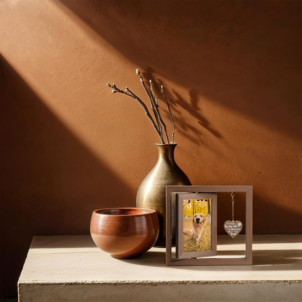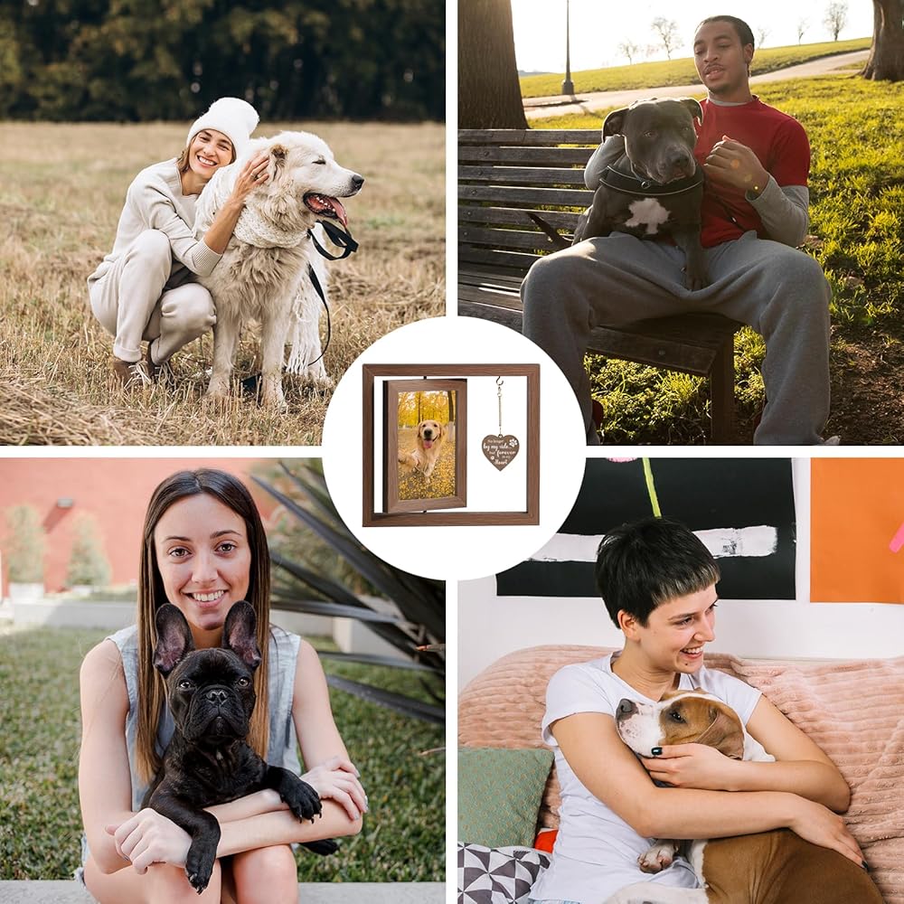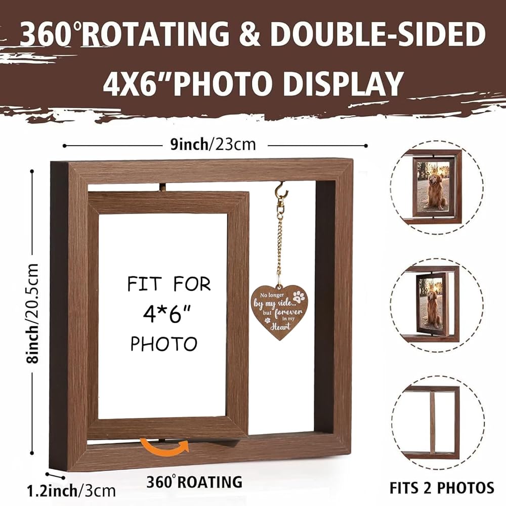 【تصميم دوار 360 درجة 】: يبلغ قياسه تقريبًا 22.86 × 20.32 سم، يمكن لهذا الإطار التذكاري للحيوانات الأليفة أن يحمل صورتين مقاس 10.16 × 15.24 سم من الخلف إلى الخلف في نفس الوقت، والذي يمكنه عرض الصور والأعمال الفنية والبطاقات البريدية والهدايا العاطفية الجيدة لتذكر عضو عزيز. من العائلة.