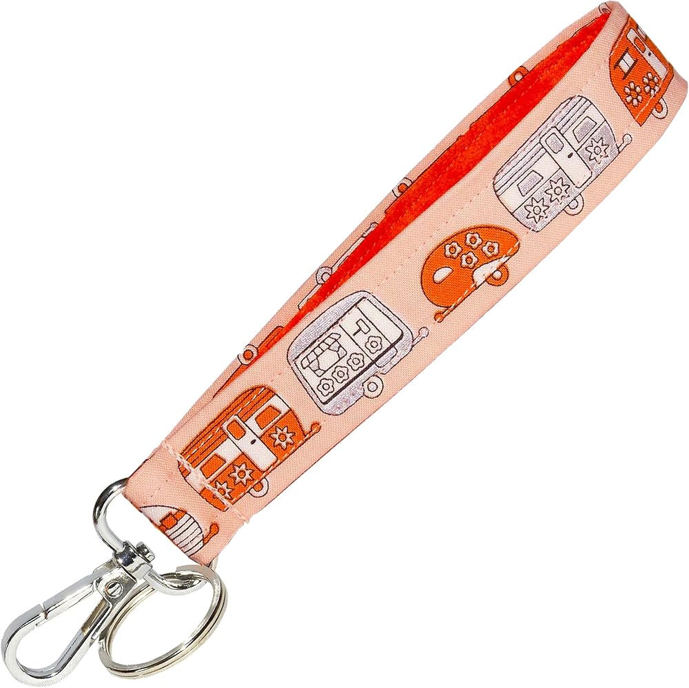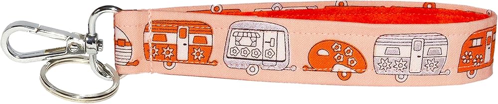 The best place to keep the keys to your camper, or use as a replacement handbag or wallet strap. This 1 inch wide, 100% cotton strap is blue with a row of blue, metallic silver and white camping travel trailers. The back side is a matching blue dragonfly print fabric, also in 100% cotton. A metal swivel clip completes the construction. Strap is durable, attractive and 100% handmade in Minnesota.