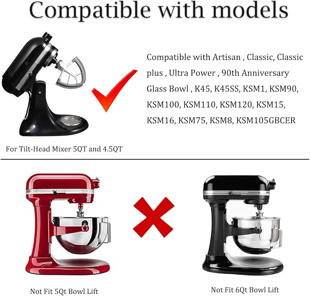 • متوافق مع: يعمل مع أوعية خلاط ذات رأس مائل بسعة 4.5-5 لتر، تناسب الطرازات: K45SS، K45، KSM1، KSM100، KSM110، KSM120، KSM15، KSM16، KSM75، KSM90، KSM8، KSM105GBCER (لا تناسب 5 QT Bowl-Lift) عجانات)