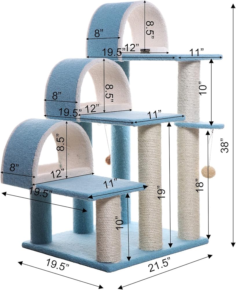 The Armarkat model B3803 Classic cat tree has three fun tunnels on three levels. Cat Daddy Approved by noted cat behaviorist Jackson Galaxy, there are three convenient steps for your feline, with each platform 11" deep. F and B Bullet: 38" High Ivory cat Step Stairs ramp is suitable for cats and Dogs Climber and Kitten Steps. It is with Scratcher and Tunnel for squeeze, snoozing and hiding fun. Made of 1.5mm pressed wood with a high density faux fleece covering for felines comfort and soft. Dimensions: Base Dimensions:24" x 20" ;. Playhouse Dimensions:12"(L) x 8"(W) x 10"(H). Six-months warranty included. Replacement parts available from manufacturer.