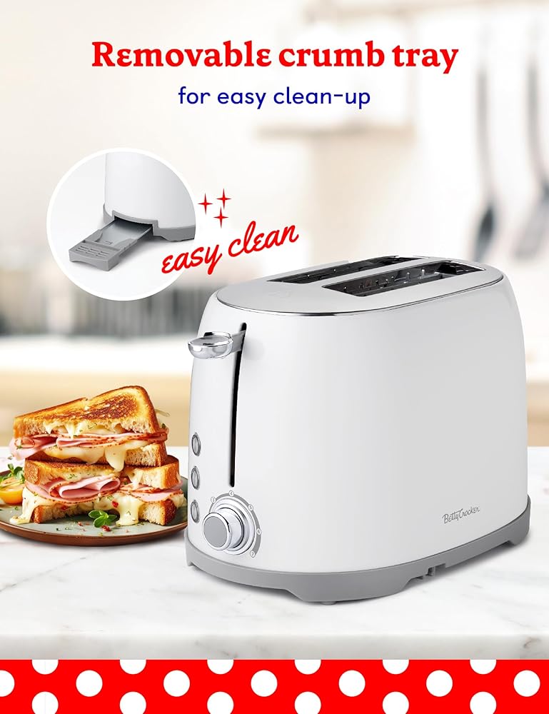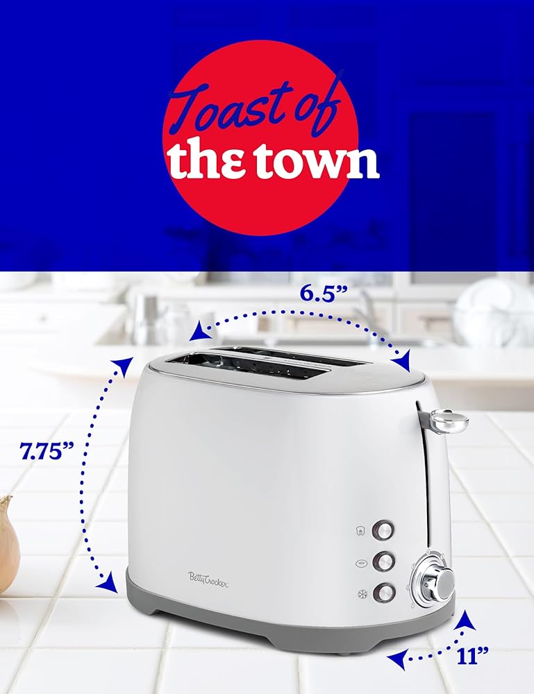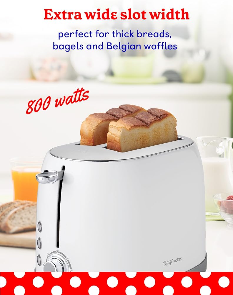• Not Just For Sliced Toast: This Betty Crocker 2 slice toaster has wide slot openings that are perfect for bagels, Belgian waffles, thick breads and toaster pastries.