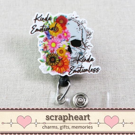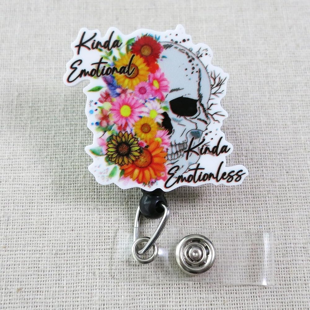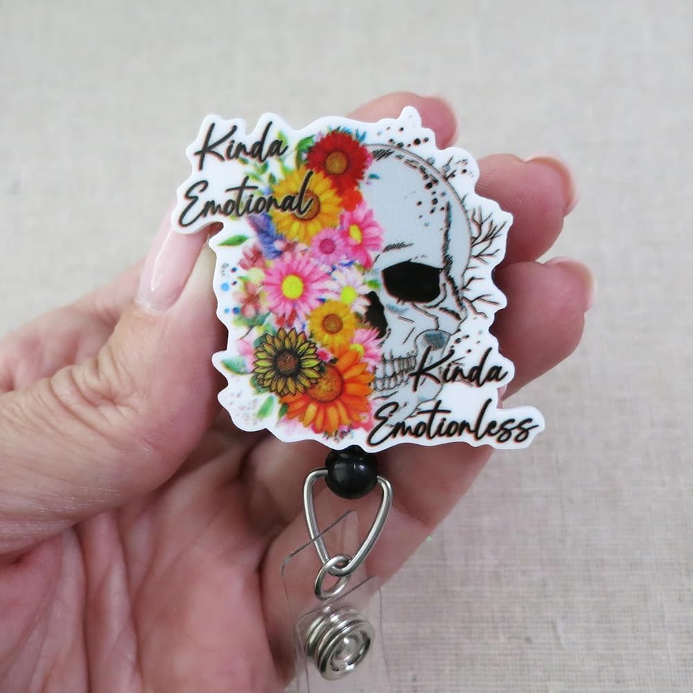 Elevate your work attire or ID badge game with our floral skull badge reel featuring the intriguing phrase, "Kinda Emotional Kinda Emotionless." This badge reel is not just a functional accessory; it's a statement piece that showcases your individuality and attitude.
