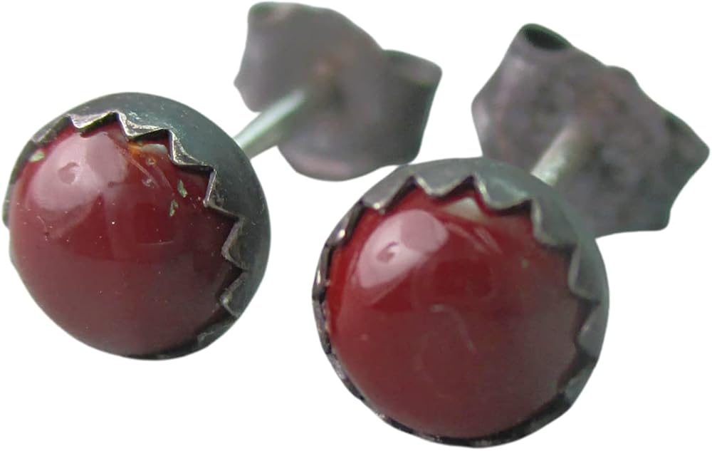 These stud earrings feature gorgeous deep red genuine Red Jasper gemstones. They are surrounded by oxidized Sterling Silver with post and earring back. The stones measure 5 mm in diameter. Great for a guy or gal. They come in nice packaging.