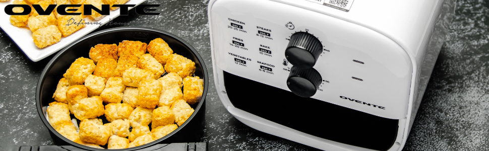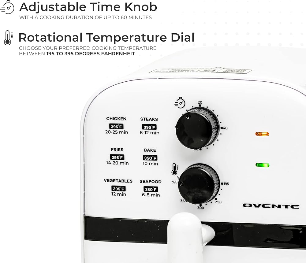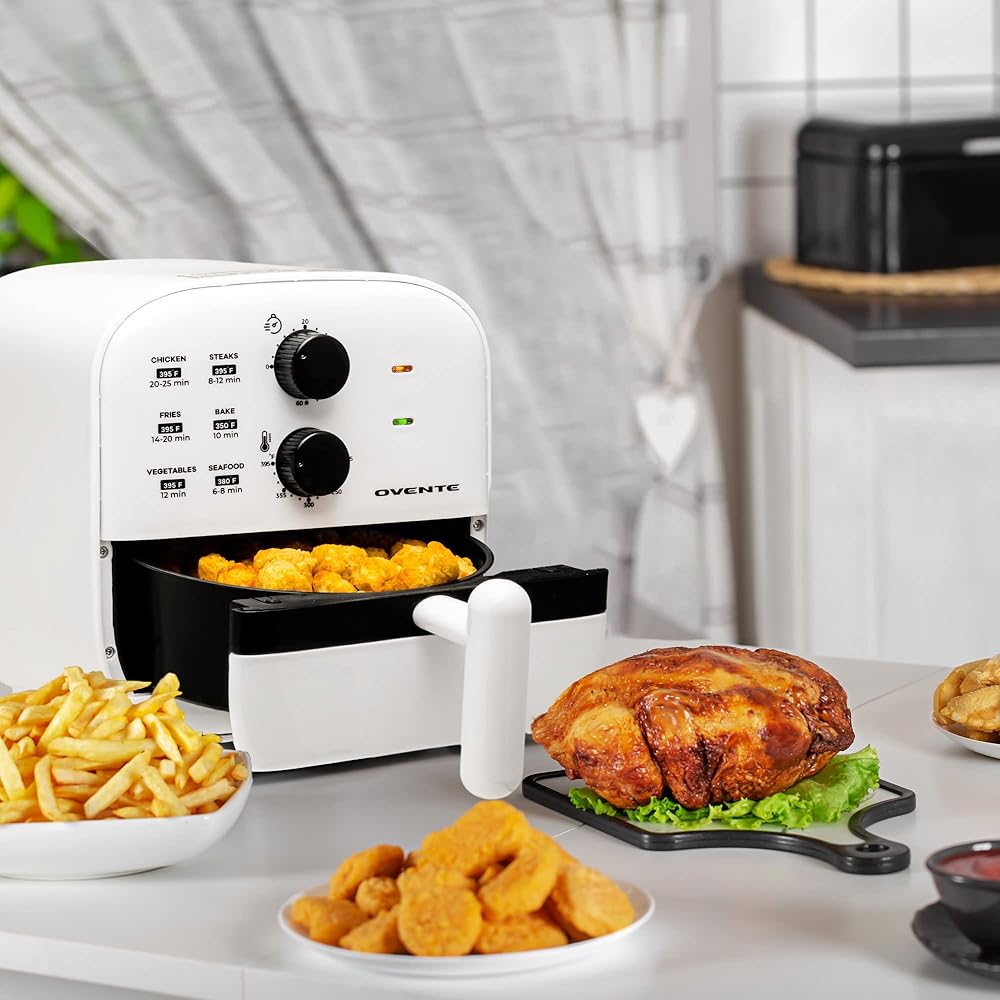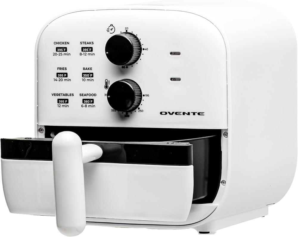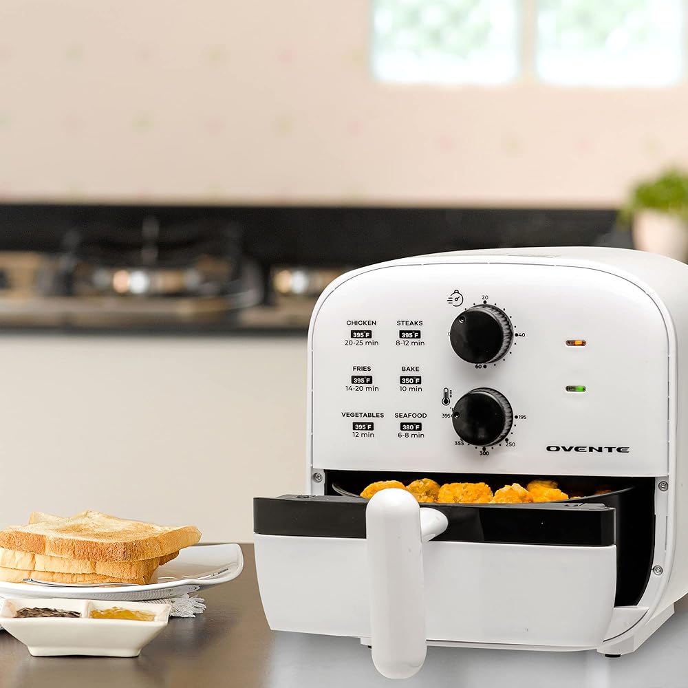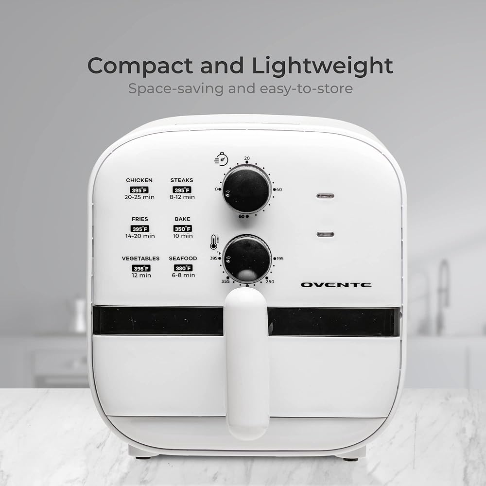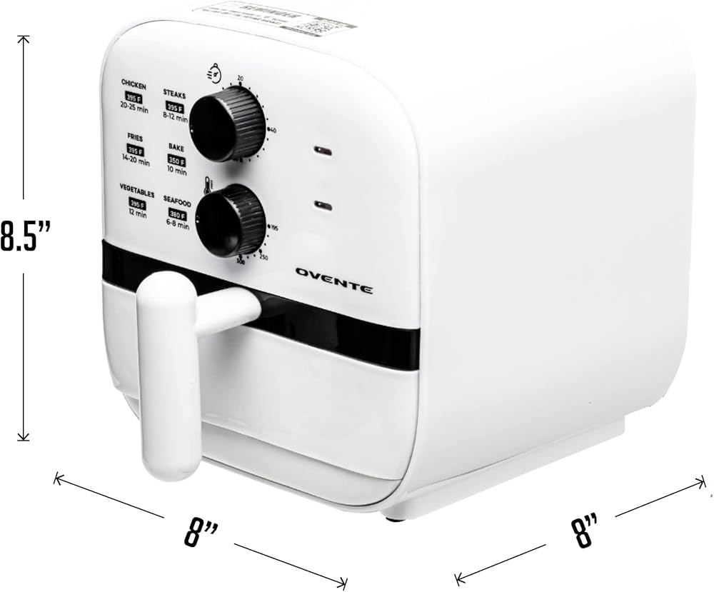 مقلاة هوائية صغيرة من OVENTE، قوة 700 واط بسعة 1 لتر، أضواء مؤشر، درجة حرارة ومؤقت قابلان للتعديل، مثالية للاستخدام الشخصي لطهي القلي الصحي والخالي من الزيت، والخبز والطعام المشوي، أبيض FAM21101W