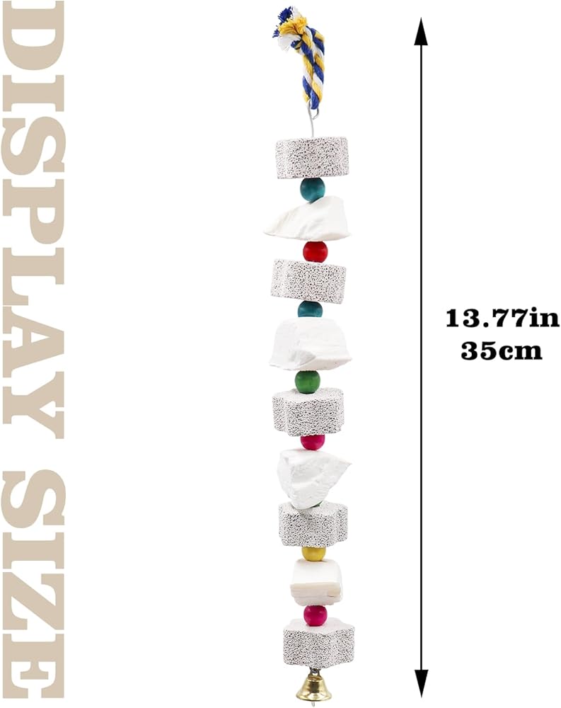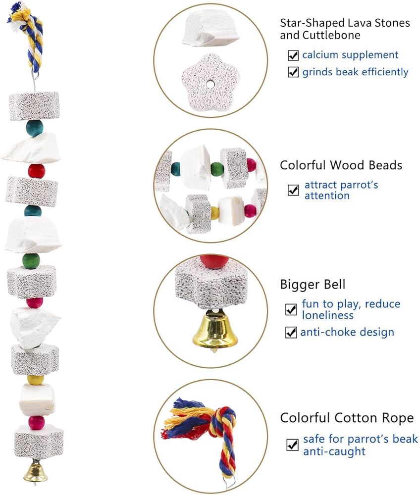 تصميم جذاب: لعبة حجر الكالسيوم للدجاج الخاصة بنا مصنوعة على شكل نجمة، جذابة ومريحة للدجاج للمضغ. يتم الانتقال بين أحجار الطحن عن طريق الخرز الملون، مما يجذب انتباه دجاجك ويضيف زخرفة إلى حظيرته. يصدر الجرس الموجود أسفل اللعبة صوت رنين لطيفًا عند النقر عليه.