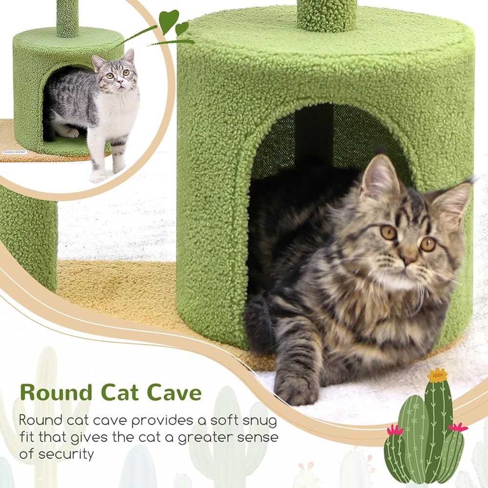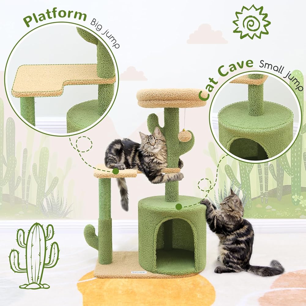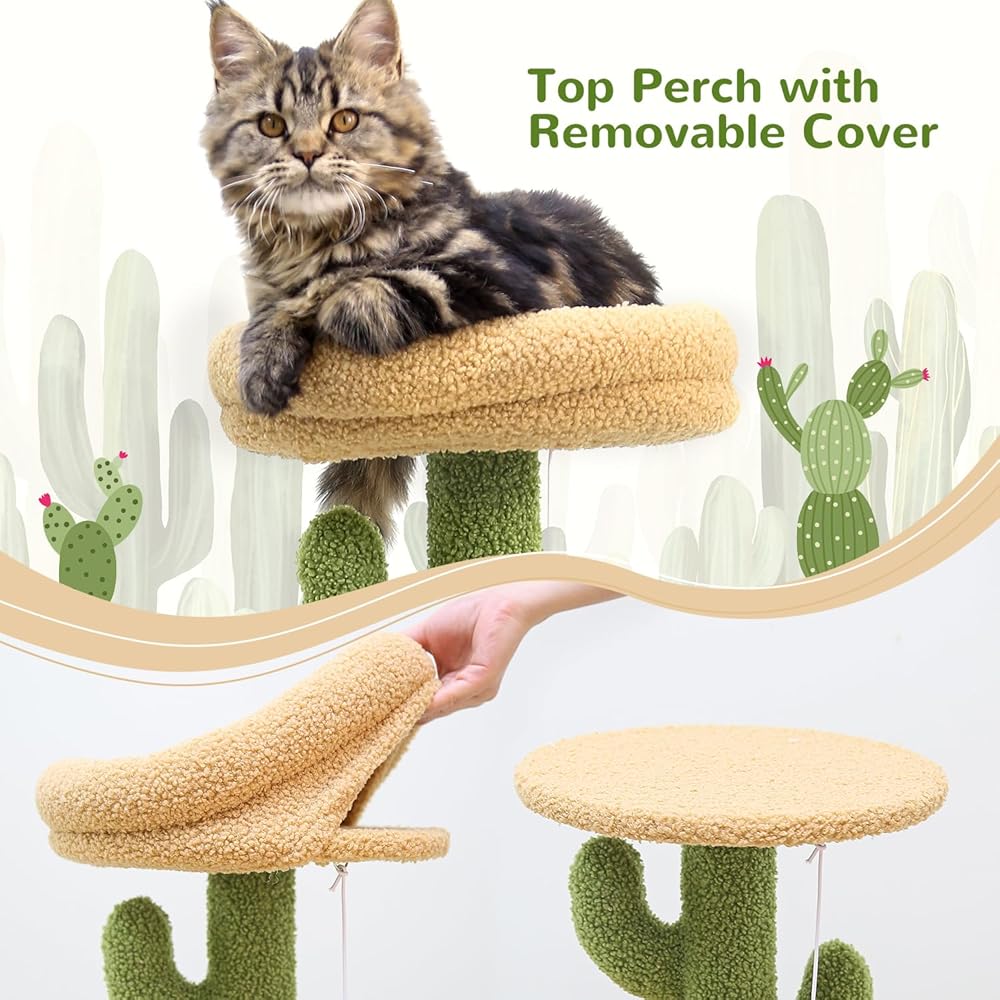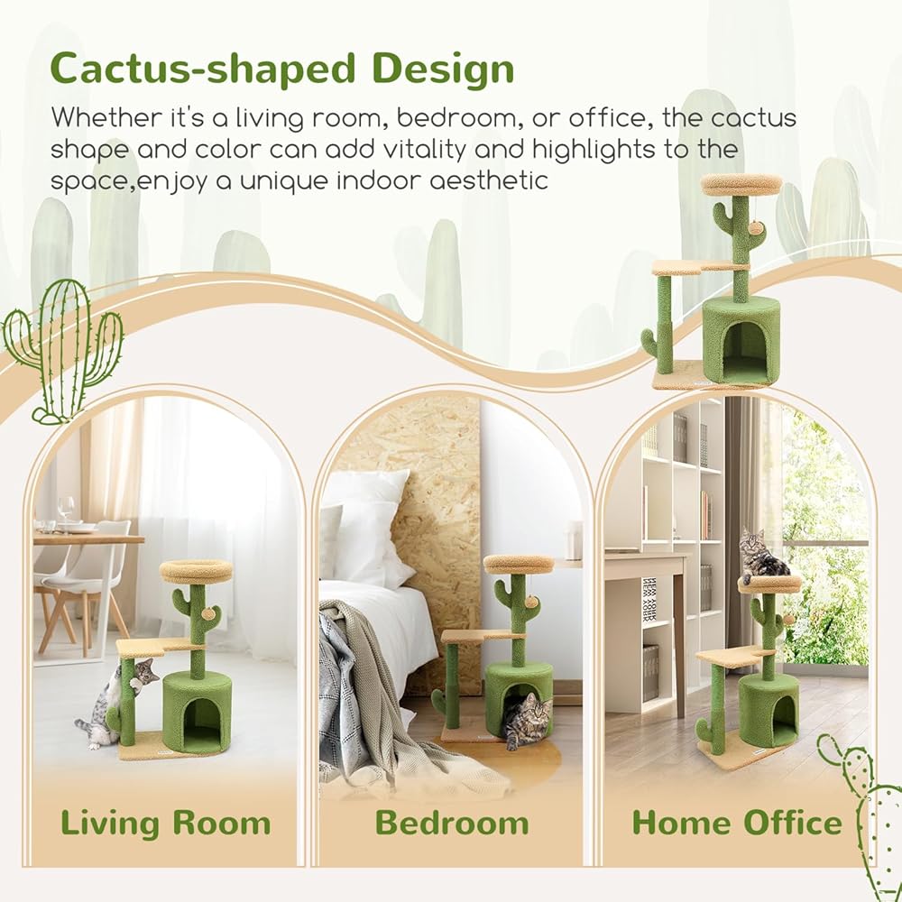تصميم جمالي على شكل صبار: تتميز شجرة القطط اللطيفة مقاس 86.36 سم بتصميم مميز على شكل صبار ونظام ألوان مختار بعناية، يرمز إلى الحياة النابضة بالحياة. أينما تضعه، فإنه يضيف لمسة شخصية ويظل جذابًا بصريًا.