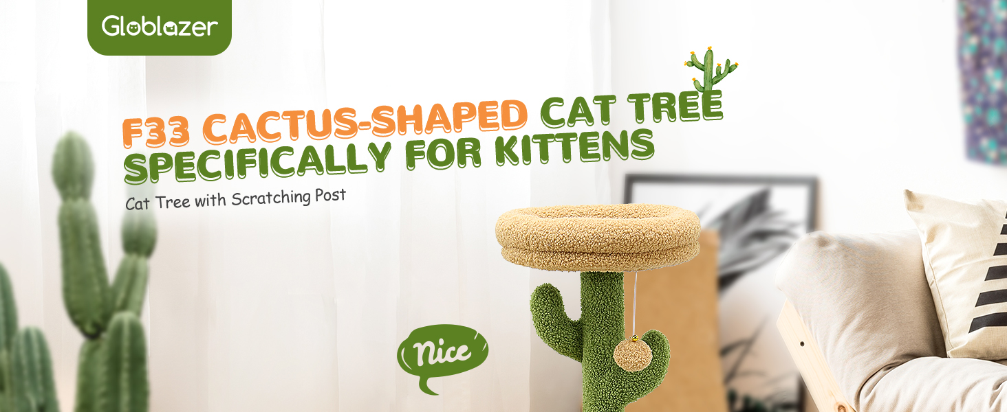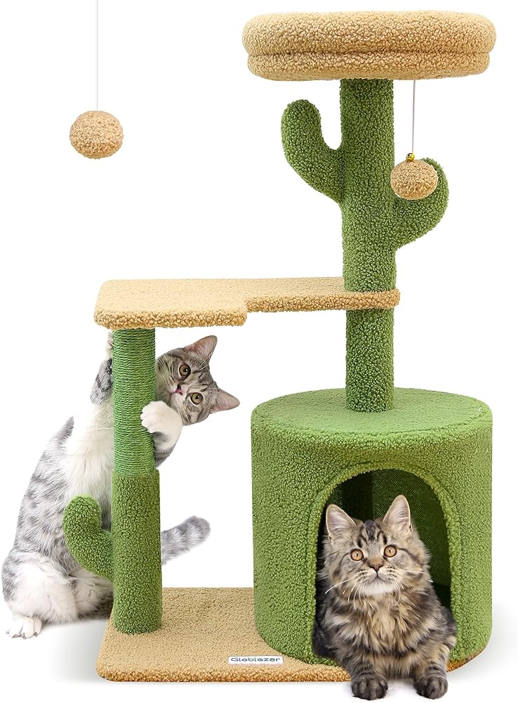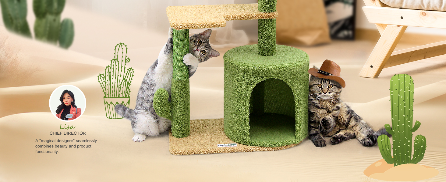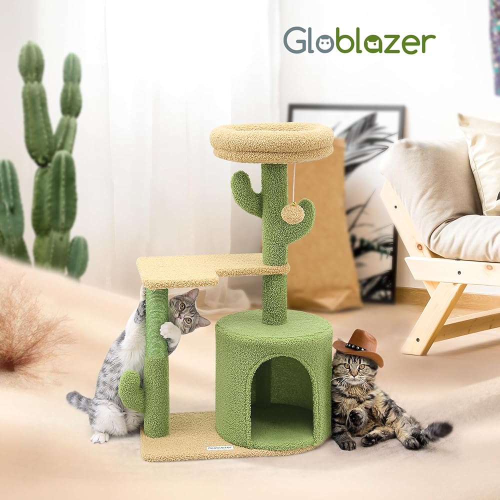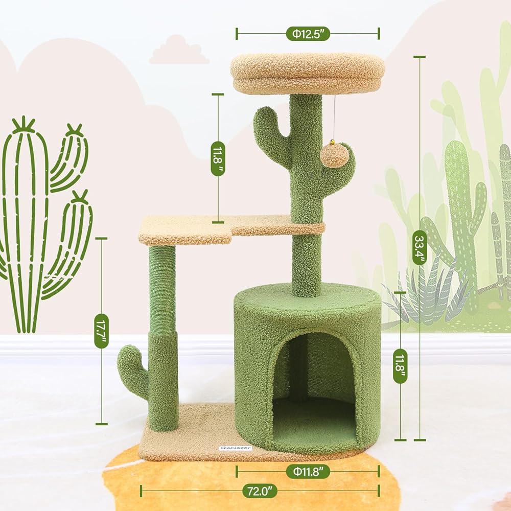 تصميم جمالي على شكل صبار: تتميز شجرة القطط اللطيفة مقاس 86.36 سم بتصميم مميز على شكل صبار ونظام ألوان مختار بعناية، يرمز إلى الحياة النابضة بالحياة. أينما تضعه، فإنه يضيف لمسة شخصية ويظل جذابًا بصريًا.