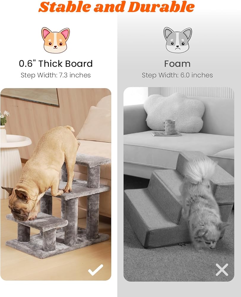 مستقرة ومتينة: مصنوعة من لوح عالي الجودة مقاس 0.6 بوصة وأعمدة قطيفة، تدعم سلالم الكلاب هذه ما يصل إلى 100 رطل. أكثر ثباتًا من السلالم والمنحدرات الإسفنجية، فهي تتميز بفراء صناعي مريح بوزن 310 جرام في المتر المربع ولوحة قاعدة ممتدة لمنحدر أكثر لطفًا وتسلقًا أسهل.