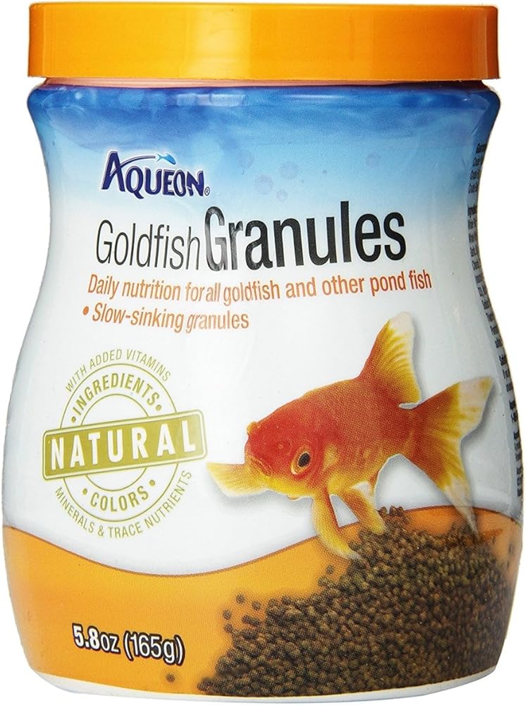 AQUEON - AQUEON GOLDFISH GRANULES 5. 8OZ. Aqueon foods contain only natural ingredients and contain no artificial colors. The colors of the foods are attributed to the actual ingredients in the formula, and help to bring out the natural colors in your fish, while keeping them energetic and healthy. Guaranteed Analysis Crude Protein (min).....35% Crude Fat (min) ..............5% Crude Fiber (max)...........5% Moisture (max).................9% Phosphorus (min)...........1%