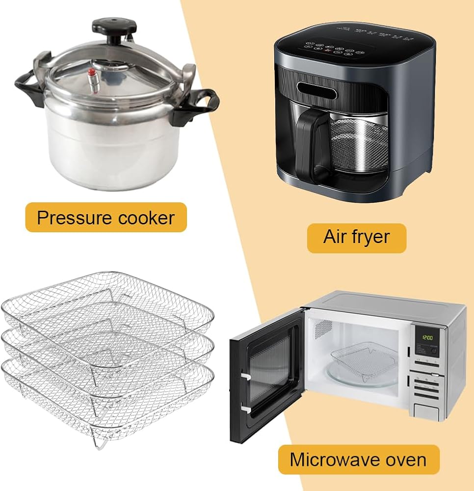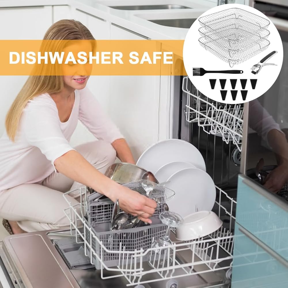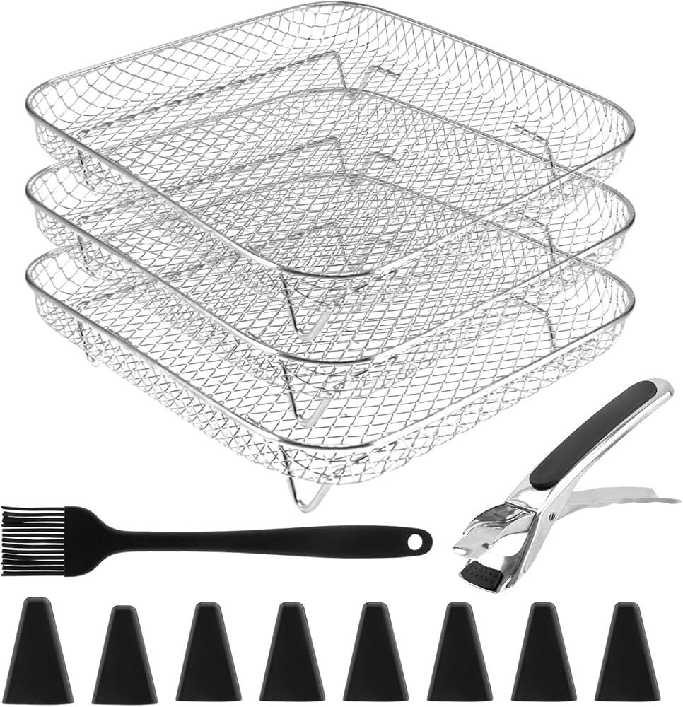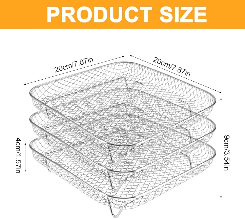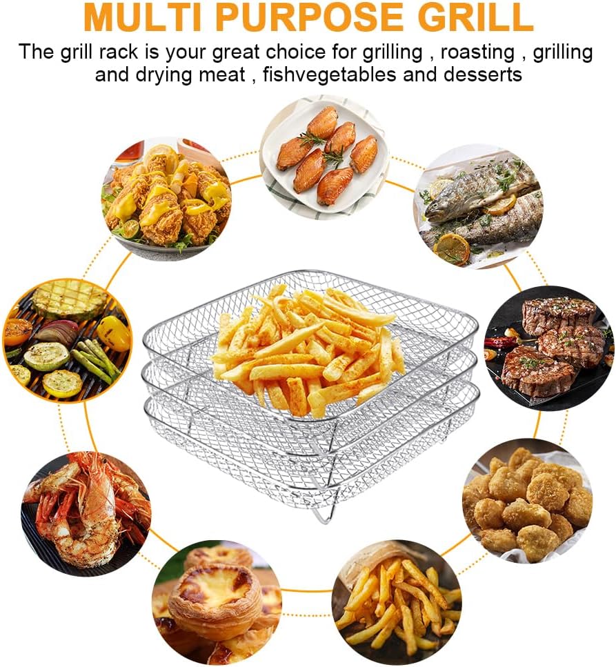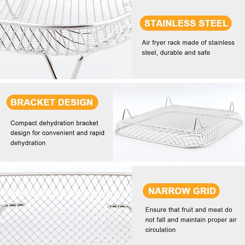 【Premium Quality Material】The air fryer racks are made with 304 food grade stainless steel, rustproof, high heat resistant and dishwasher safe. Its mesh design can improve air circulation around the food, keeping the food crispy on all sides.