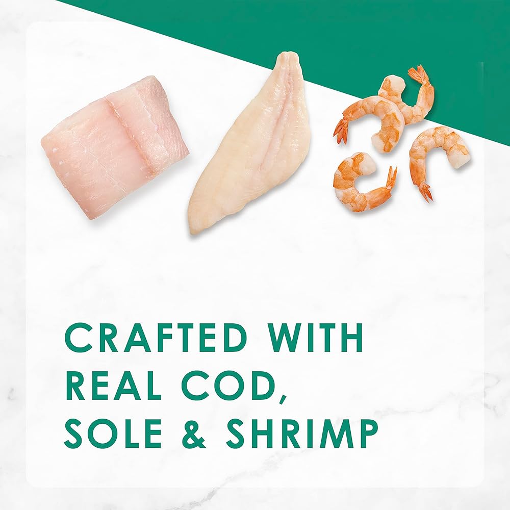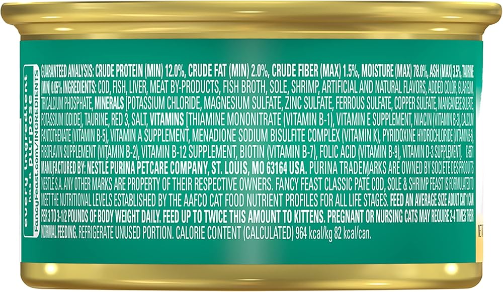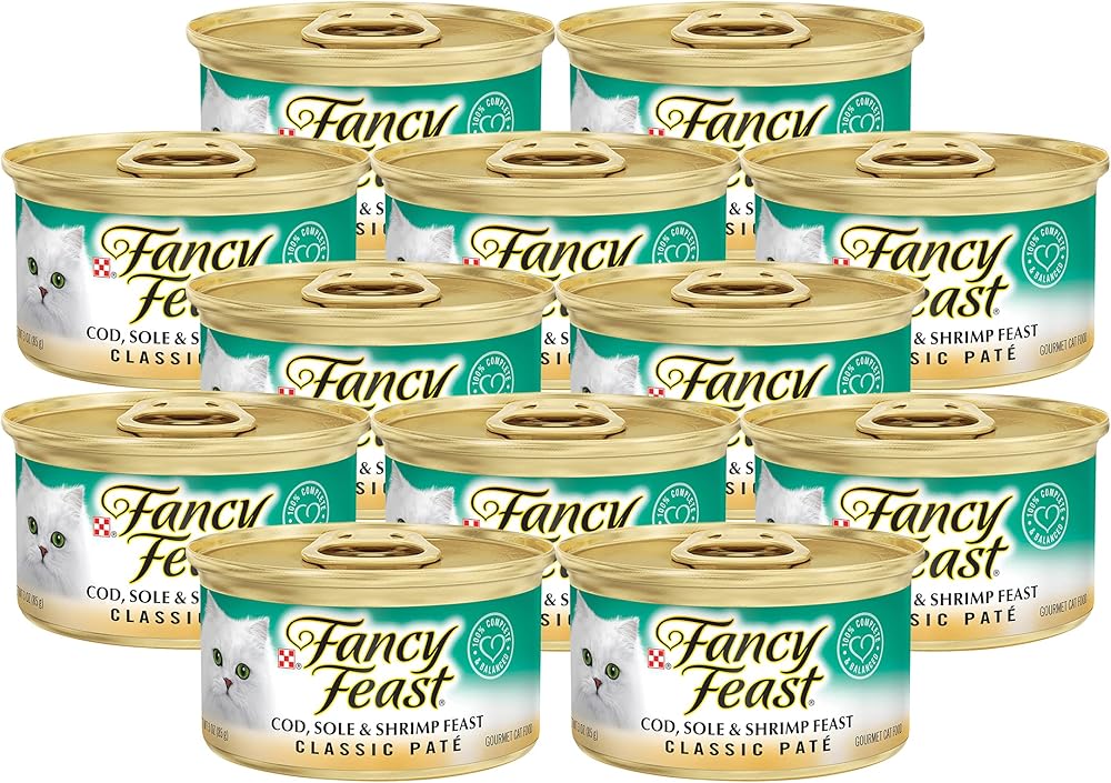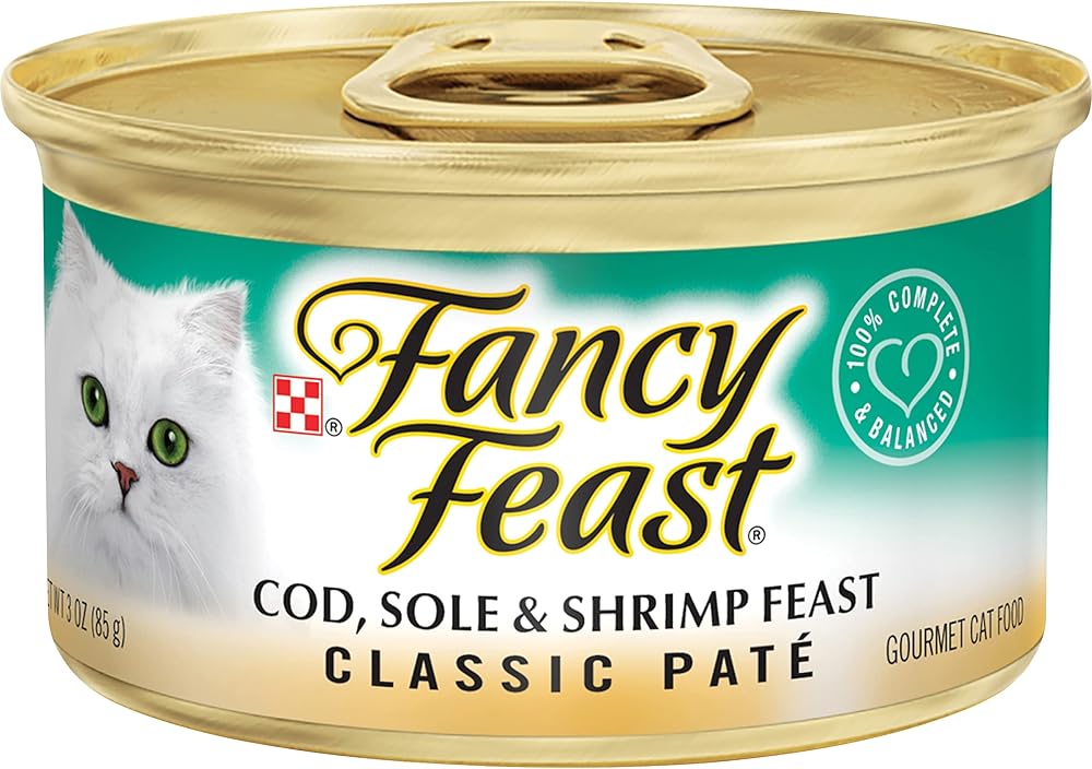 Purina Fancy Feast Classic Pate Wet Cat Food, Cod, Sole & Shrimp Feast, Gourmet Wet Cat Food, 3 Ounce Can: Packaged in easy-to-open, recyclable cans. Give your cat the luxury she deserves by serving her Purina Fancy Feast Classic Pate Cod, Sole and Shrimp Feast wet cat food. The smooth pate is perfect for even the choosiest of cats. With real cod as the first ingredient and 100 percent complete and balanced nutrition, this recipe gives your cat both the taste she wants and the nutrition she needs. Each can of Purina Fancy Feast Classic Pate contains a tasty meal just waiting for her to enjoy. Fill her bowl with this enticing blend of seafood that makes her feel like she's just spent a busy day by the ocean, while the blend of vitamins and minerals in each serving helps carry her through whatever adventure she chooses. You can feel secure in giving her this wet cat food, as the savory flavor enhances each nutritious and delicious bite, and your cat can enjoy a meal that is truly a Fancy Feast designed to support her fun-filled life with you.