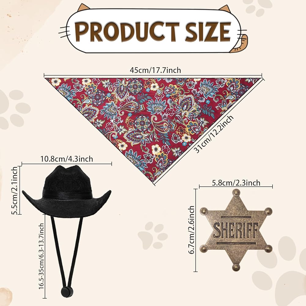 المقاس: قبعة رعاة البقر لدينا: الطول*العرض*الارتفاع 15.5*12.8*6 سم/6.1*5*2.4 بوصة، حزام الذقن 16.5 سم/6.3 بوصة (حزام مرن، يمكن تمديده حتى 35 سم/13.7 بوصة). المنديل: الطول*العرض 70*45 سم/27.5*17.7 بوصة. الشارة: الطول*العرض 5.8*6.7 سم/2.3*2.6بوصة/. يرجى التحقق من أبعاد حيوانك الأليف قبل الشراء.