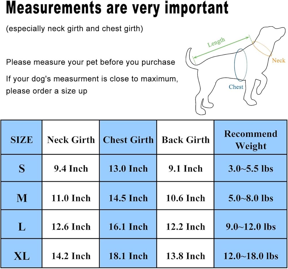 المقاس M: محيط الرقبة-11.0 بوصة، محيط الصدر-14.5 بوصة؛ طول الظهر--10.6 بوصة، يوصى به من 5.0 إلى 8.5 رطل. المقاس صغير، القياسات مهمة جدًا (خاصة محيط الرقبة ومحيط الصدر)، يرجى قياس حيوانك الأليف والرجوع إلى خريطة المقاسات قبل الشراء، لا تختار الحجم على أساس اسم السلالة/الحجم.