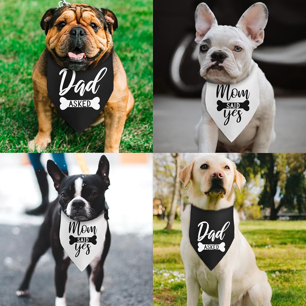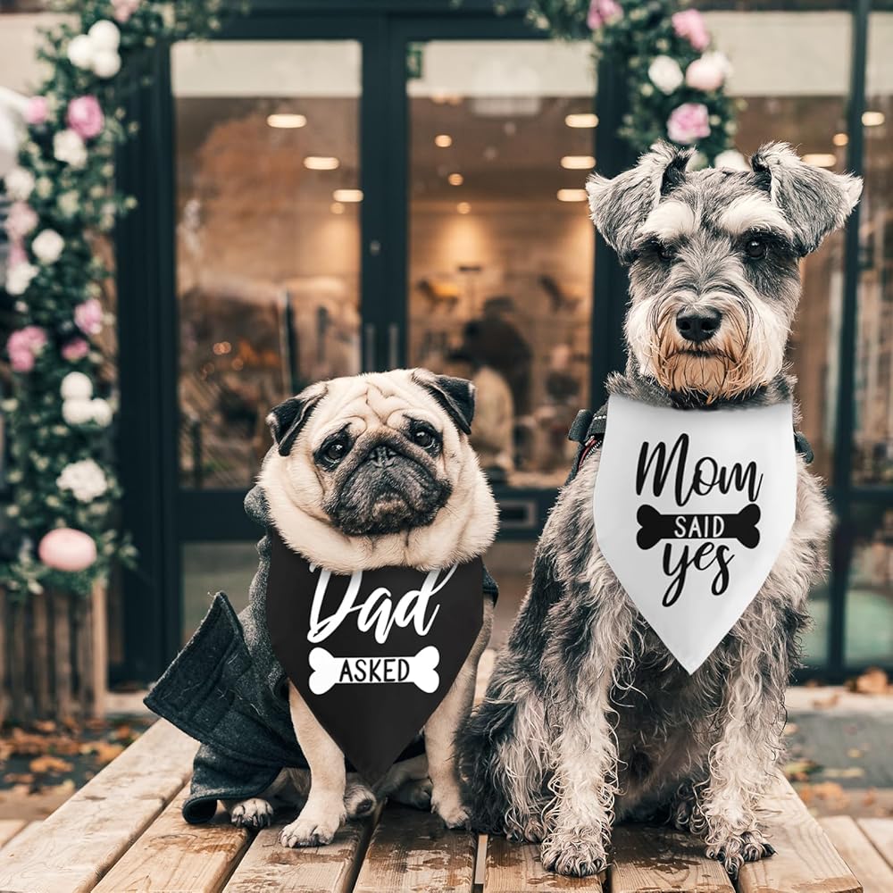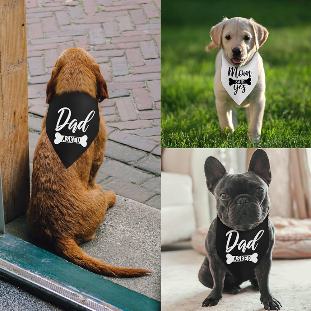 • 1.[Engagement gifts for couples]:Unique pack of 2 printed pattern"dad asked,mom said yes",celebrate your wedding engagement party with you pet!Give them as gifts to any dog lovers in your life.